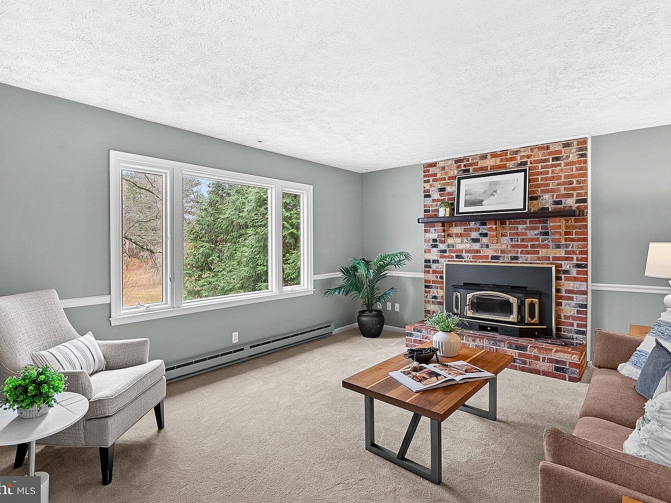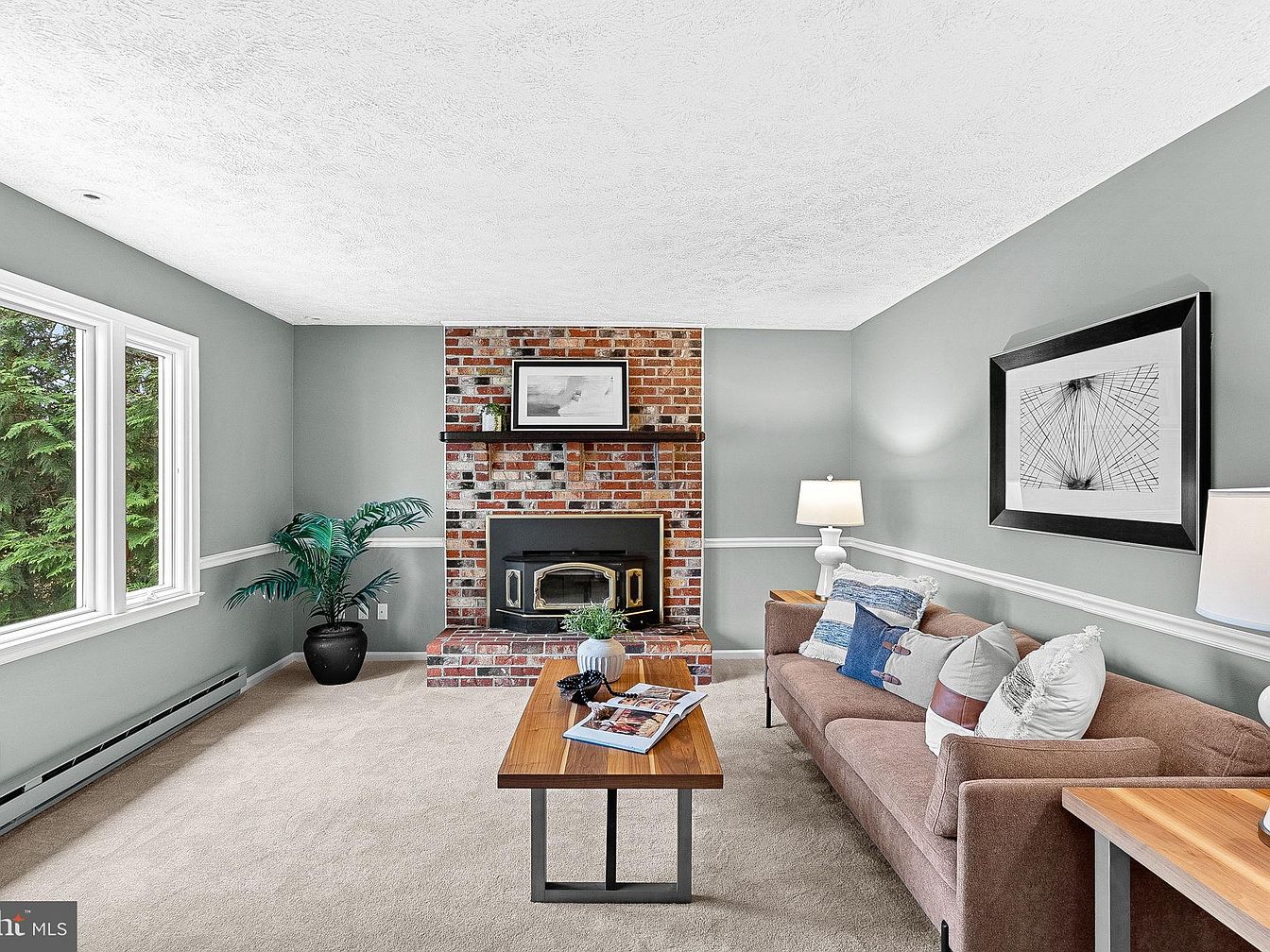 This living room features a cozy layout with plush beige carpeting and soft, muted grey walls. A large window invites natural light, highlighting the sleek, modern sofa adorned with decorative pillows. The brick fireplace serves as a focal point, framed by a wooden mantle displaying art and a plant accent. A contemporary coffee table provides functionality, balancing aesthetics with light wood and metal elements. Two elegant lamps glow warmly beside the sofa, paired with decorative plants enhancing the inviting atmosphere. The room balances warmth with contemporary charm, ideal for relaxation and social gatherings.