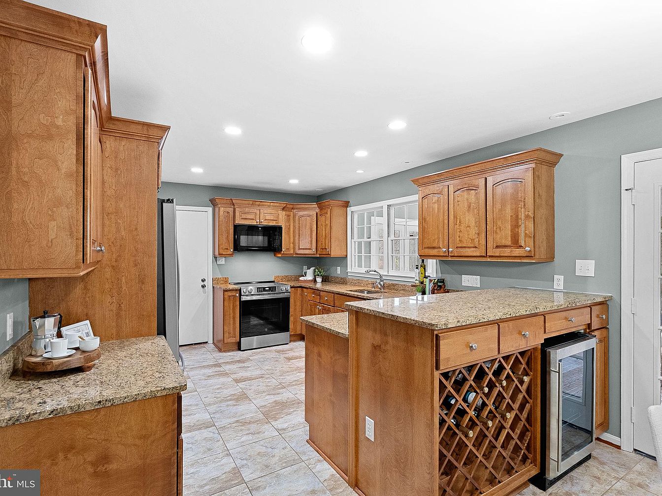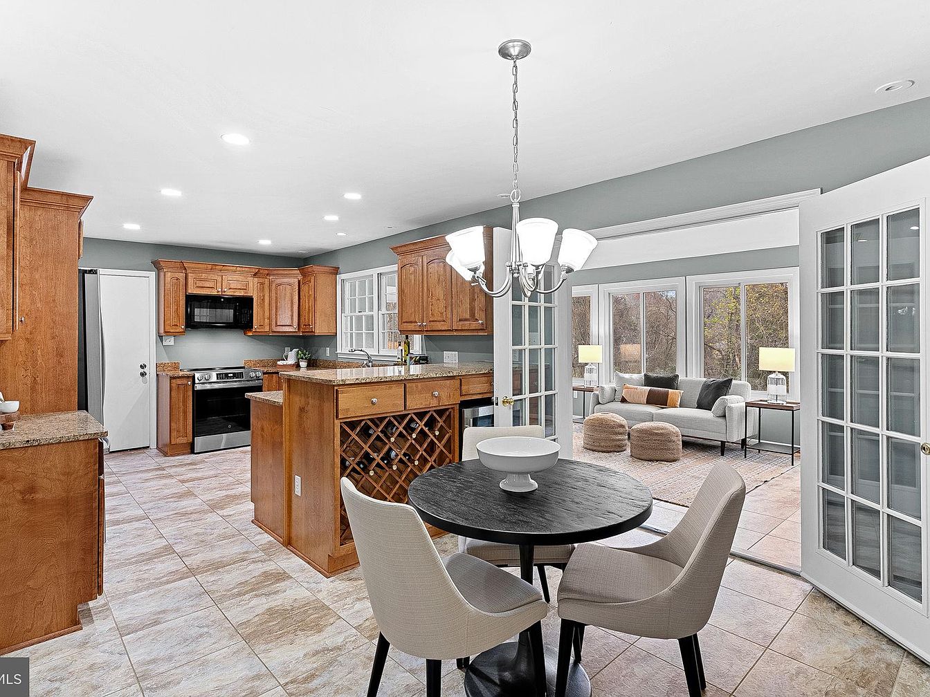 This spacious kitchen features warm wooden cabinetry, complemented by a granite countertop. A large central island invites casual dining, while a built-in wine rack adds a touch of elegance. Light gray walls enhance the openness, contrasted by the earthy tones of the tiled floor. Modern stainless steel appliances include a range and microwave, creating a seamless blend of function and style. Adjacent, large glass doors lead to a cozy seating area filled with natural light, furnished with a soft sectional and accent pillows. Overhead, a stylish chandelier adds a contemporary touch to this inviting space.