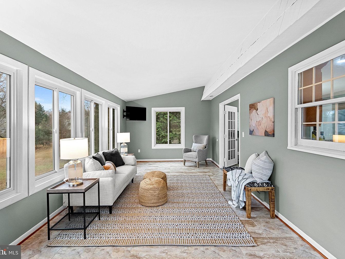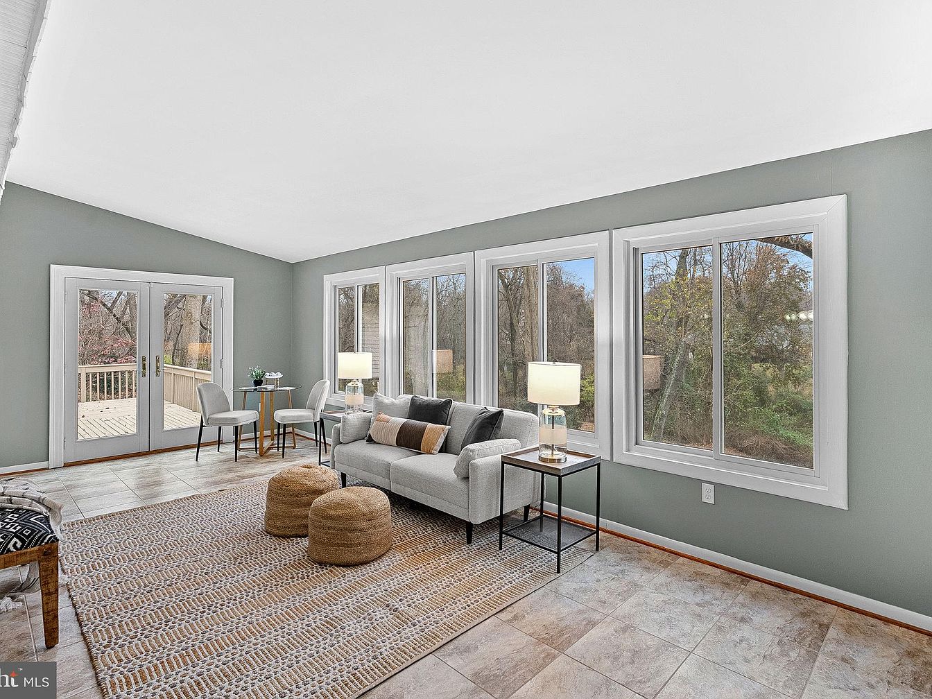 The sunroom features a warm and inviting atmosphere with large, rectangular windows that flood the space with natural light. Soft green walls complement the beige tiled floor, enhancing the room’s organic feel. A cozy gray sofa, adorned with decorative pillows, is paired with rustic poufs that add texture. A sleek side table stands beside the sofa, topped with a stylish lamp, while two chairs and a small table create a charming conversation nook near the French doors, which lead to a wooden deck. The neutral color scheme is accented by natural materials, promoting a serene and tranquil ambiance.