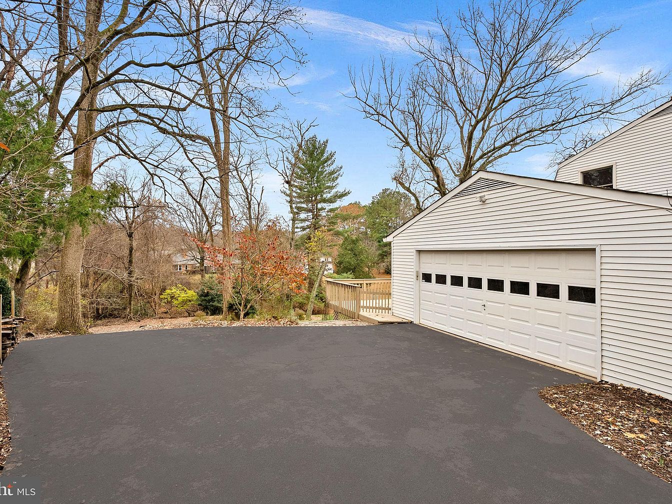 A spacious driveway leads up to a light-colored, modern garage with a classic white panel door. Minimalist design elements include a clean, even asphalt surface that contrasts with the natural landscape. Surrounding the driveway, tall, leafless trees provide a sense of depth, their branches reaching towards a clear blue sky. A mix of seasonal foliage in shades of green and orange adds pops of color, enhancing the natural beauty. The area is bordered by gravel and mulch, offering a neat, organized look while seamlessly blending into the earthy surroundings. A welcoming entryway to the home.