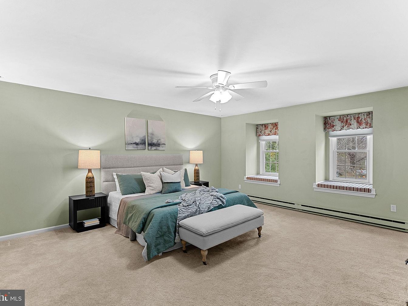 This spacious bedroom features a calming soft green color scheme, complemented by light beige carpeting that enhances the warmth of the space. A large upholstered bed sits center stage, adorned with decorative pillows in varying shades of teal and white, drawing attention to its elegant headboard. On either side, sleek black nightstands hold modern, sculptural lamps that add a touch of sophistication. Natural light filters through two charming windows, dressed with floral valances, while a cozy bench at the foot of the bed invites relaxation. The ceiling fan provides comfort, making the room feel airy and inviting.