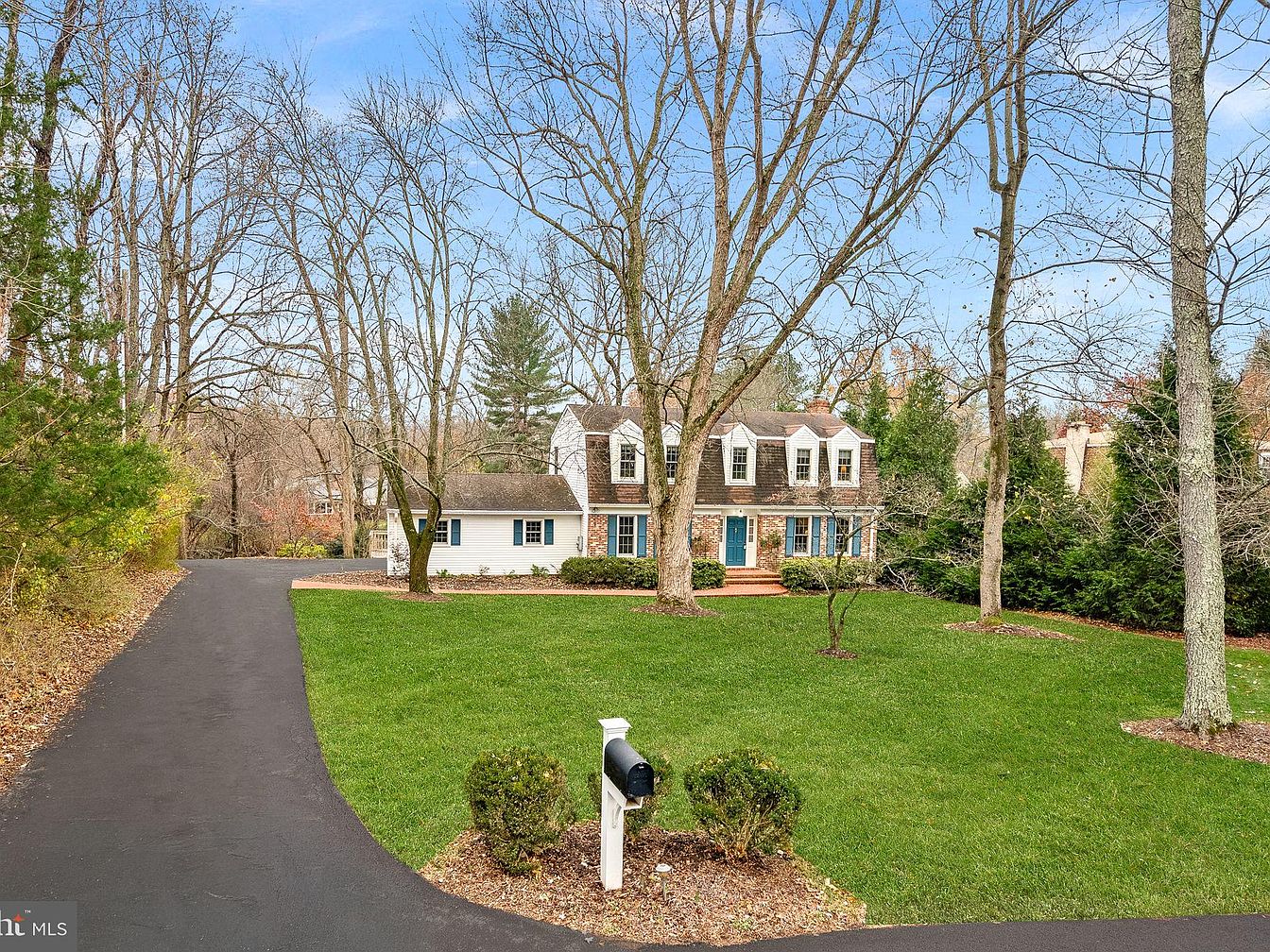A spacious front yard features lush green grass framed by tall, bare trees which suggest a seasonal change. The house, with its charming façade, boasts a mix of brick and white siding. Large windows adorned with traditional shutters present a welcoming vibe. A slate gray driveway curves gently towards the front entrance, accented by manicured shrubs. The porch, reachable by steps, showcases a classic style with a tasteful doorway that hints at the home’s history. Surrounding foliage creates a natural border, enhancing the tranquil and inviting ambiance of this residential space.