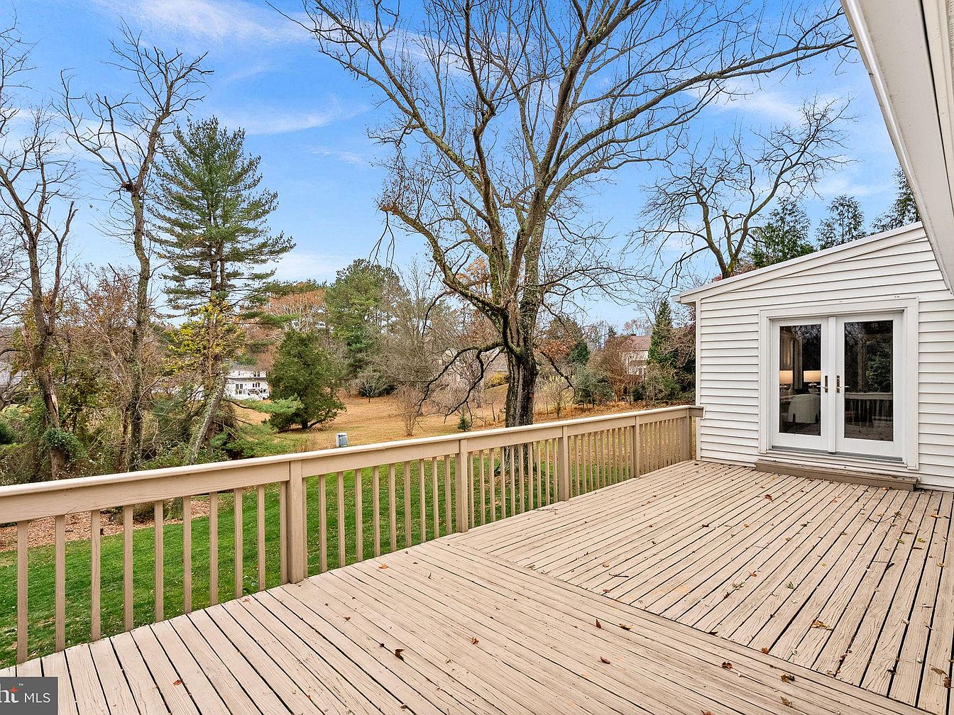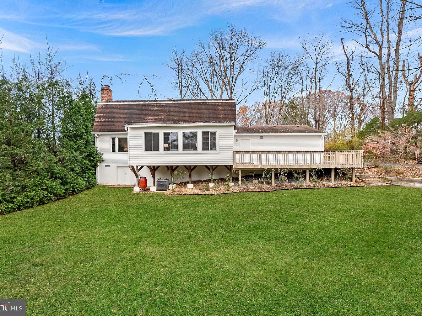 This exterior view showcases a charming American home with a spacious deck extending from the back. The house features a light-colored siding, complemented by a dark, sloped roof. Large windows fill the sides with natural light, providing a welcoming ambiance. The well-maintained lawn showcases vibrant green grass, bordered by subtle landscaping including bushes and small trees, enhancing the outdoor charm. Surrounding the home, a wooded area adds natural privacy, reflecting seasonal changes with subtle autumn colors. A sturdy deck railing encircles the porch, offering an inviting space for relaxation and outdoor gatherings.