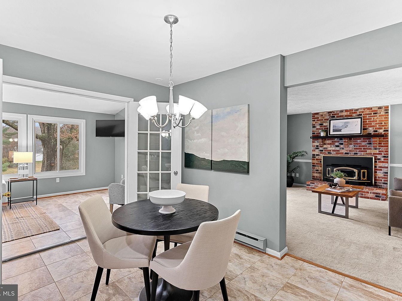This cozy dining area features a round black table surrounded by plush, cream-colored chairs, creating an inviting atmosphere. Walls are painted in a soft gray, enhancing the warmth of the tiled floor in beige tones. Natural light streams in through large windows, showcasing the outdoors. A beautiful chandelier hangs above the table, complementing the decor. To the left, elegant French doors lead to a separate living space, which includes a striking brick fireplace that acts as a focal point for the adjacent room. The space is accented by tasteful wall art and minimalistic decor, promoting simplicity and relaxation.