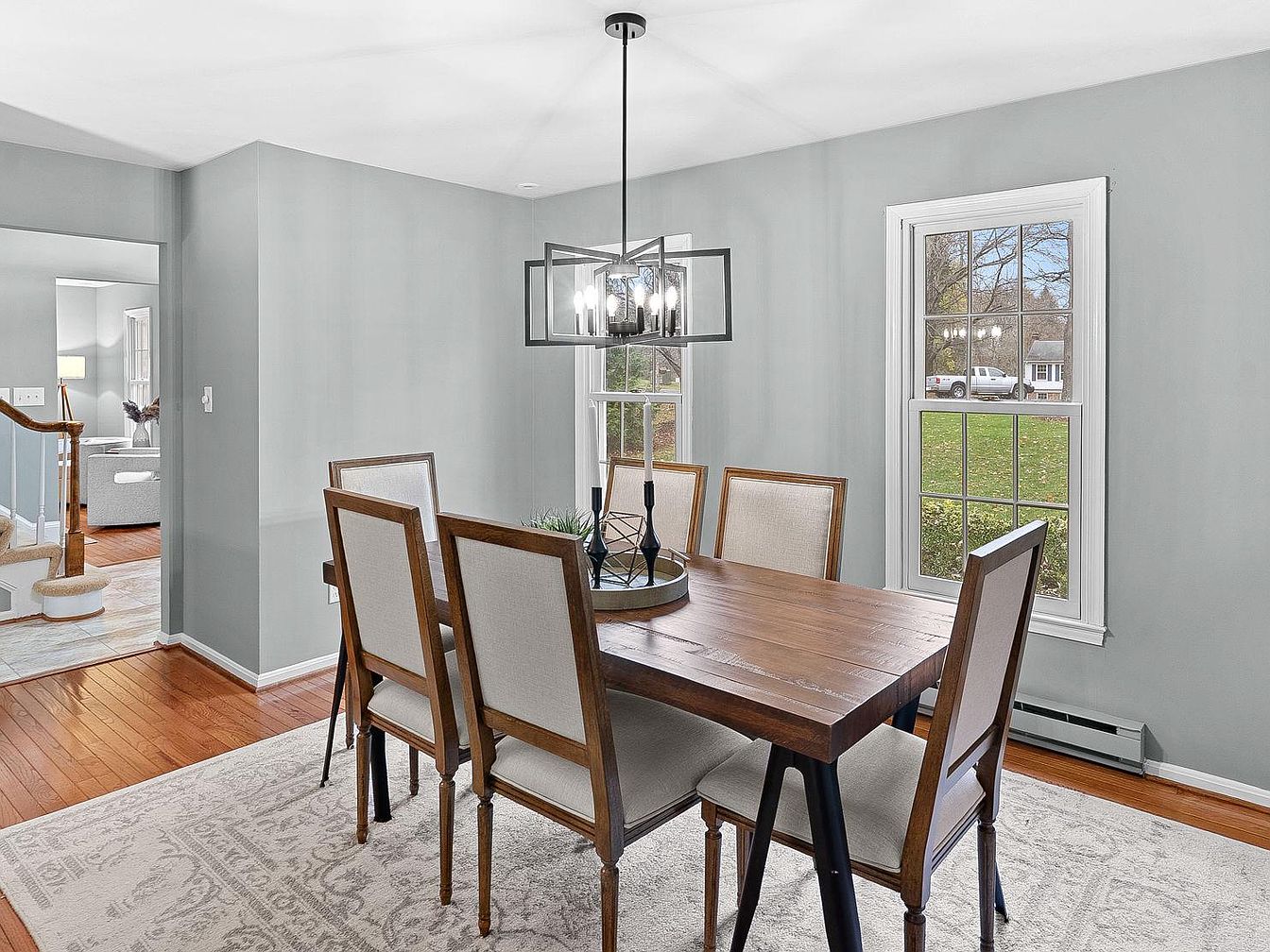 A cozy dining room featuring a warm wood table flanked by plush, light-colored chairs with subtle upholstery. The walls are painted a soft gray, enhancing the inviting atmosphere. A geometric chandelier casts a warm glow over the table, adding a contemporary touch. Light hardwood flooring contrasts pleasantly with a delicate area rug, which adds texture. Large windows allow natural light to flood in, showcasing greenery outside. An open doorway leads to the adjacent living space, promoting an airy flow. Overall, the layout emphasizes functionality and comfort, ideal for casual family dining or entertaining guests.