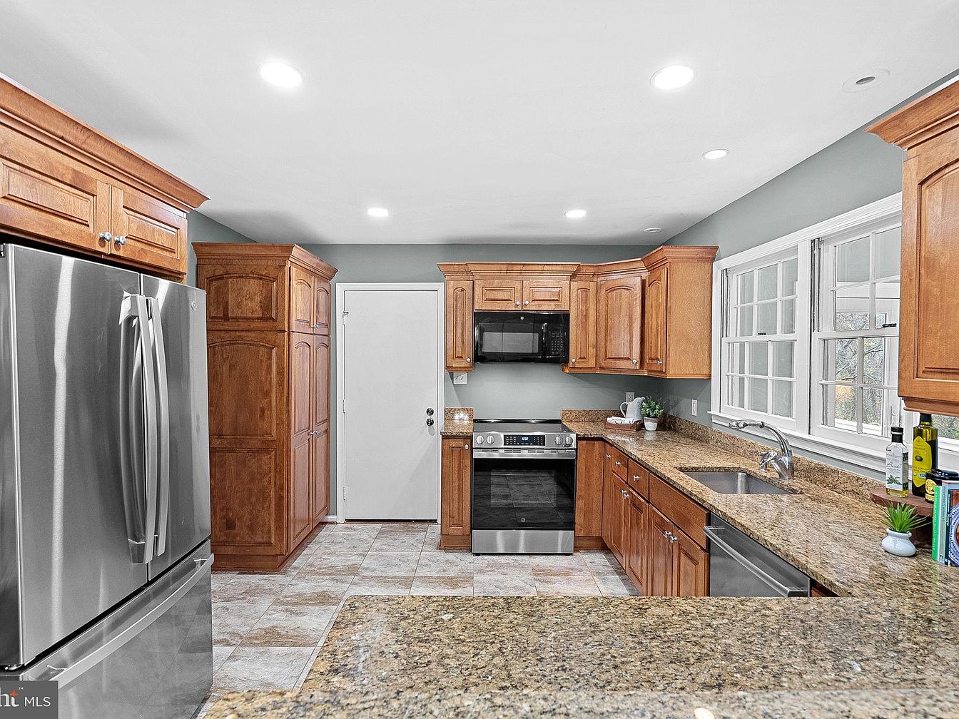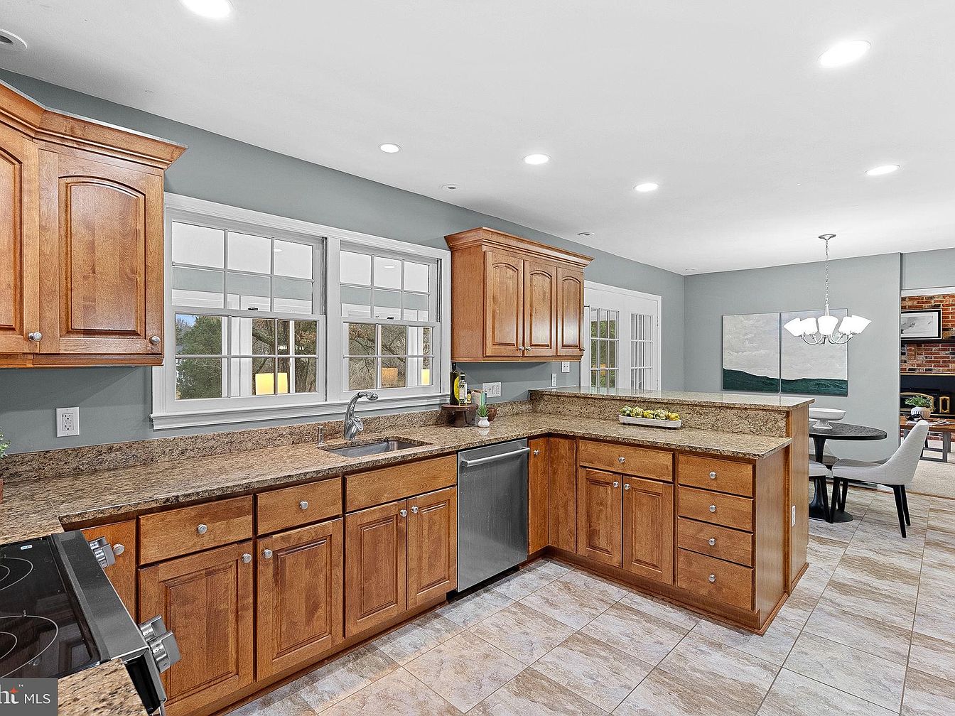 This kitchen showcases a blend of functionality and warmth with its rich wooden cabinetry and sleek granite countertops. The warm wooden tones of the cabinets contrast beautifully against the soft gray walls, creating a cozy yet modern ambiance. Ample natural light floods in through the multiple windows, enhancing the space. The stainless steel appliances add a contemporary touch, while the subtle tile flooring in light earth tones offers a clean look. To the side, a round dining table with elegant chairs invites casual dining, complementing the overall aesthetic of comfort and style within this inviting kitchen space.