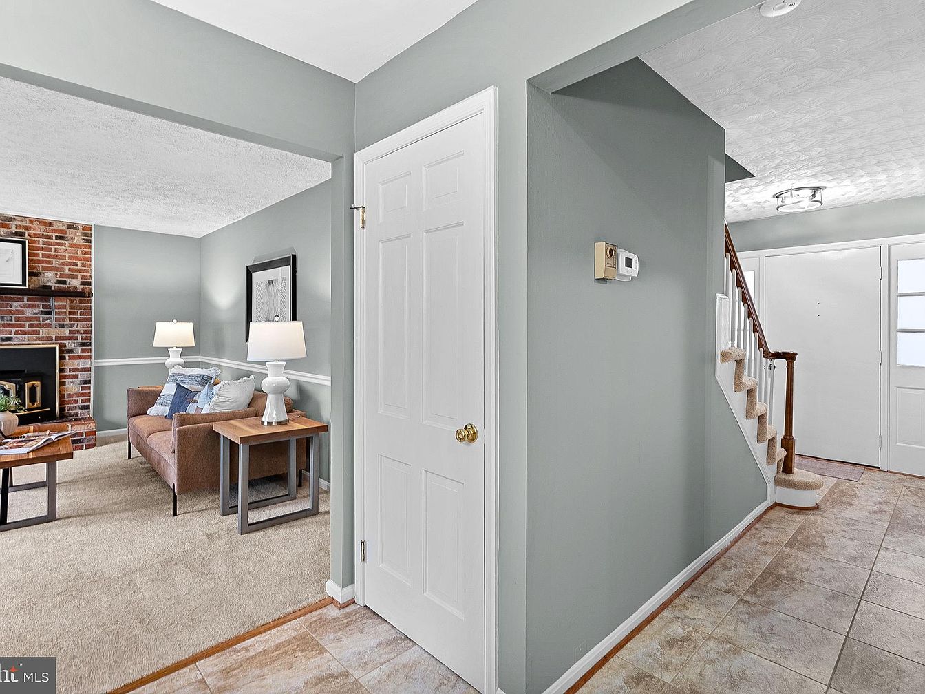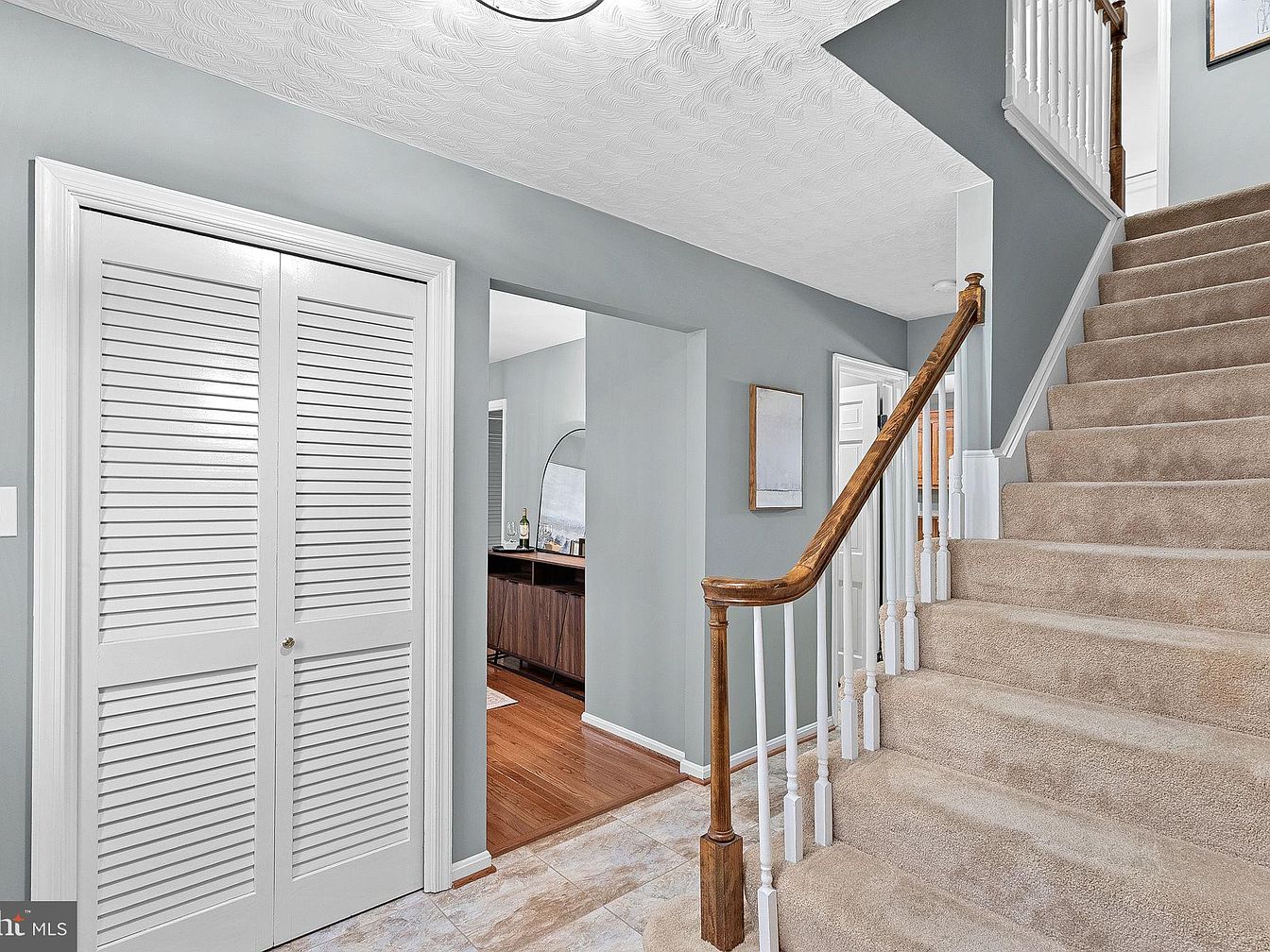 A well-designed staircase hall features a plush, beige carpet that leads up the stairs, complemented by a soft gray wall finish creating an inviting atmosphere. Natural light filters in from a nearby window, enhancing the openness of the space. To the left, a door opens to a utility closet, while a framed artwork adds a touch of personality. The flooring transitions smoothly from tile to rich wood, providing a warm contrast. At the end of the hall, glimpses of a cozy living area are visible, hinting at a seamless flow between spaces, reflecting a modern yet classic aesthetic.