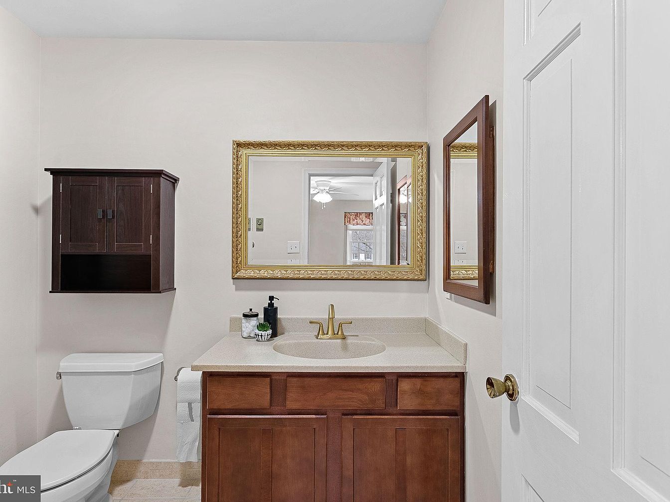 A compact bathroom showcasing a blend of modern and classic design elements. The light beige walls contrast softly with the rich brown cabinetry below the sink. A matching, elegant framed mirror enhances the space, reflecting light and depth. The countertop is made of a pale stone, providing a subtle texture that complements the cabinetry. Above, a dark wood cabinet offers functional storage while maintaining a streamlined look. The gold fixtures deliver a touch of luxury against the neutral palette. The white toilet is neatly positioned, ensuring a clean, uncluttered appearance, while bright lighting keeps the ambiance inviting.