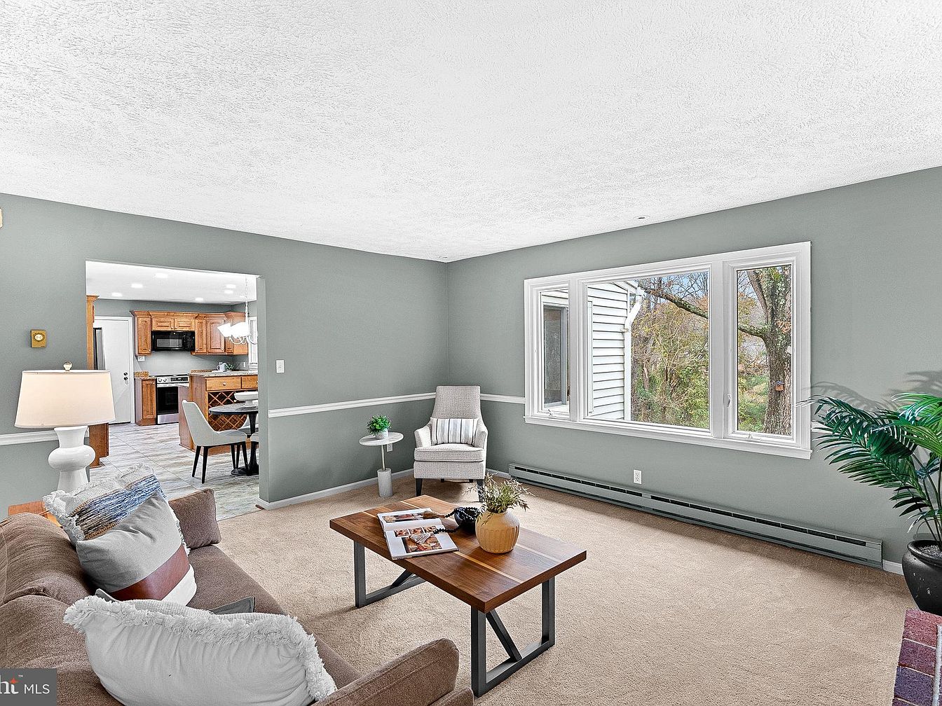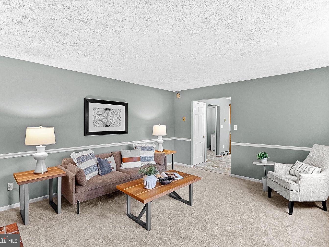 The living room showcases a cozy and inviting atmosphere. Soft beige carpeting complements light gray walls adorned with white trim. A comfortable brown sofa, accented with decorative pillows, faces a wooden coffee table, creating a relaxing space for gatherings. A sleek armchair with a light gray and white striped pattern sits beside a potted plant, adding a touch of greenery. An expansive bay window floods the room with natural light, offering a view of the serene outdoors. Through an open archway, the kitchen and dining area are visible, promoting a seamless flow throughout the home.