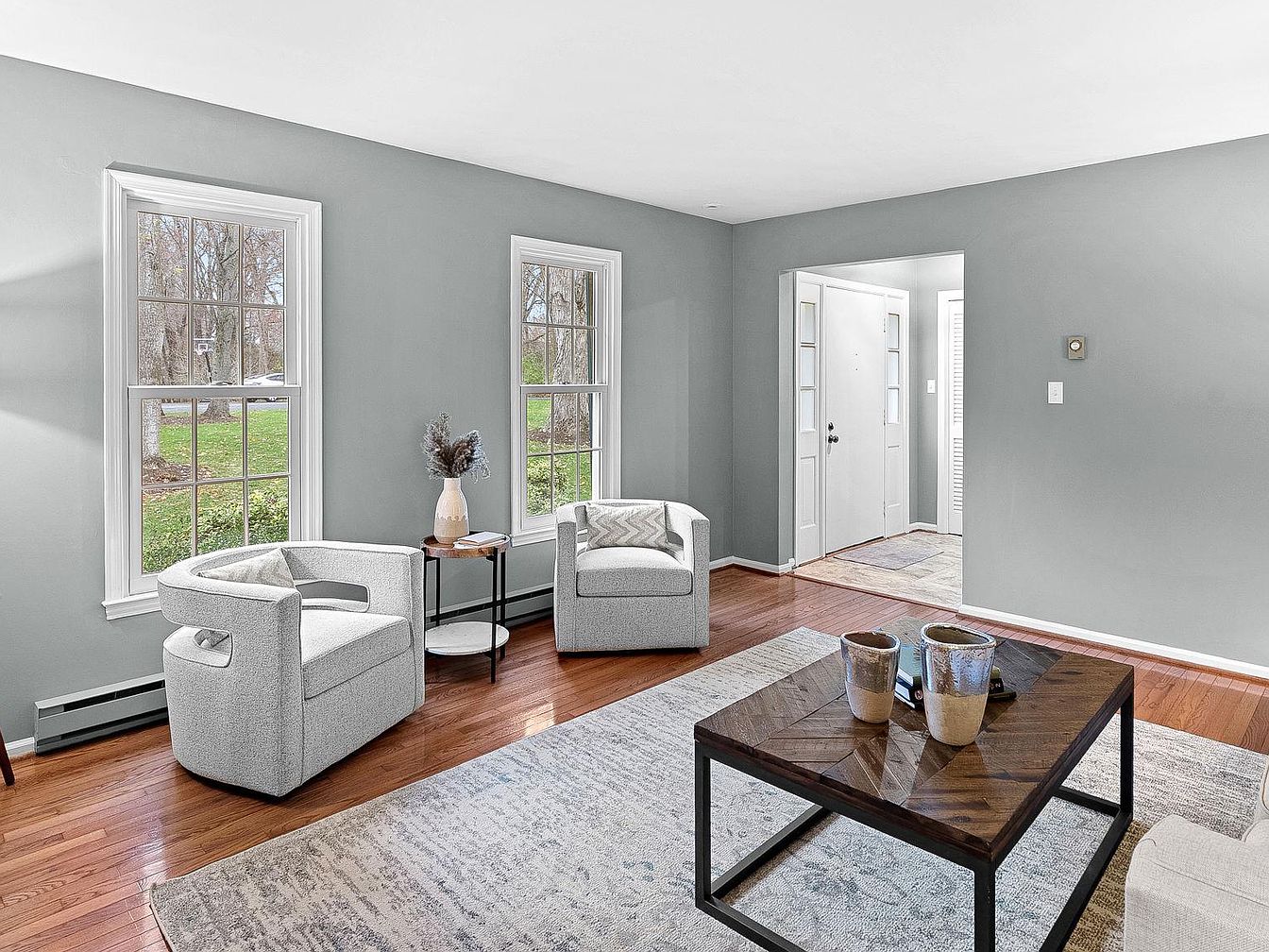 The living room features a calming color palette with soft gray walls that complement the warmth of the polished hardwood floor. Two cozy chairs with a modern design, upholstered in light fabric, are positioned around a stylish wooden coffee table. The table’s geometric patterns and dark frame add an elegant touch to the space. Natural light floods through the tall, multi-paned windows, allowing views of the lush greenery outside. A simple vase with an arrangement of dried flowers sits on a small side table, enhancing the room’s minimalist aesthetic. The entrance is visible, suggesting a welcoming atmosphere.