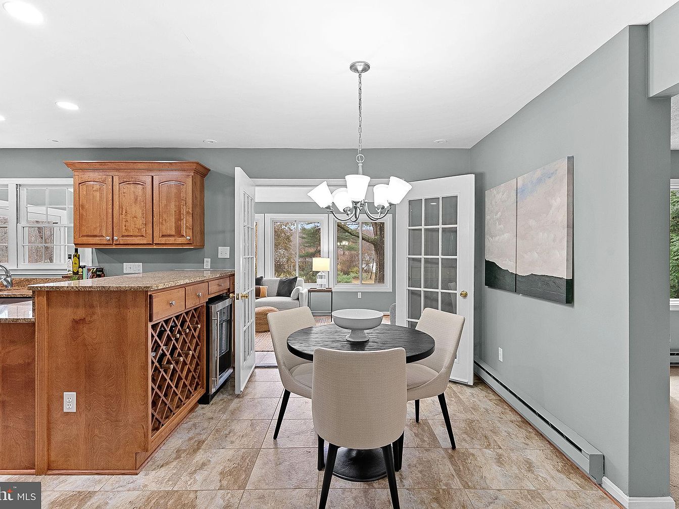 A cozy dining space with a circular black table surrounded by light-colored upholstered chairs. The walls are painted a subtle gray, enhancing a modern aesthetic. A stylish chandelier hangs above the table, providing soft lighting. Behind, a wooden cabinet showcases wine storage, paired with matching cabinetry featuring warm wood tones. French doors allow natural light to flow in and open to an inviting living area. Large windows reveal an outdoor view, creating a connection to nature. The tiled flooring complements the overall design, providing a seamless transition between kitchen and dining areas.