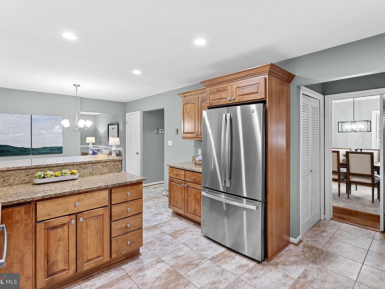 This spacious kitchen features a blend of modern and classic design. Rich wooden cabinets with a warm finish complement the sleek stainless steel refrigerator and appliances. The countertops showcase a subtle speckled granite, providing a practical yet elegant workspace. Soft gray walls act as a neutral backdrop, enhancing the overall brightness from recessed lighting and a central chandelier. A long kitchen island, topped with decorative bowls of fruit, serves both as a prep area and gathering spot. Adjacent pathways lead into the dining area, connecting functionality with a cozy ambiance, perfect for family interactions.