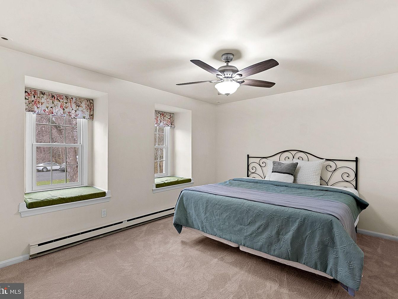 This cozy bedroom features a light color palette with soft beige walls and plush beige carpeting, creating a serene atmosphere. A black metal headboard complements the muted tones of the bed linens, which include a textured teal blanket and decorative pillows in varied patterns. Two large windows adorned with floral patterned valances allow natural light to flood the room, accented by pleasant green window seats. The ceiling fan adds a touch of functionality, while the simplicity and elegance of the space highlight thoughtful design choices meant for comfort and relaxation.