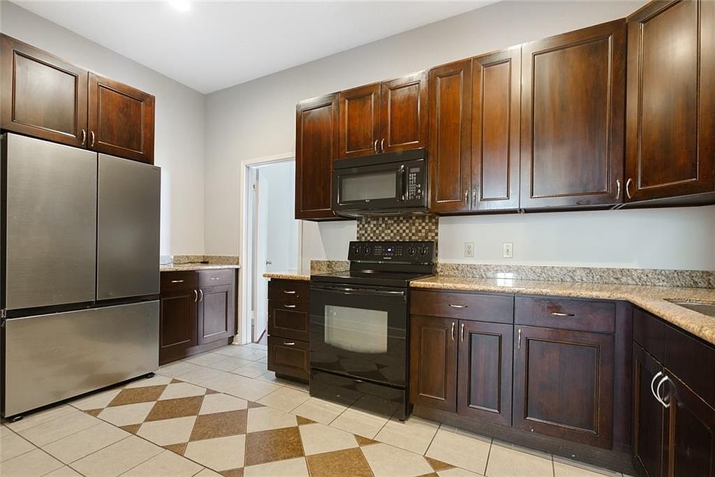Warm and inviting kitchen featuring rich, dark wood cabinets arranged in an L-shaped layout that maximizes both counter and storage space. The appliances, including a sleek double-door stainless steel refrigerator, oven, and microwave, are clustered along two adjacent walls for convenience. The countertops are a speckled beige granite, complemented by a mosaic tile backsplash in earthy tones behind the stove. Neutral-toned walls and a patterned tile floor with a diamond motif in beige and tan add visual interest, while the ample overhead lighting keeps the space bright and functional. The overall style combines traditional cabinetry with modern appliances.