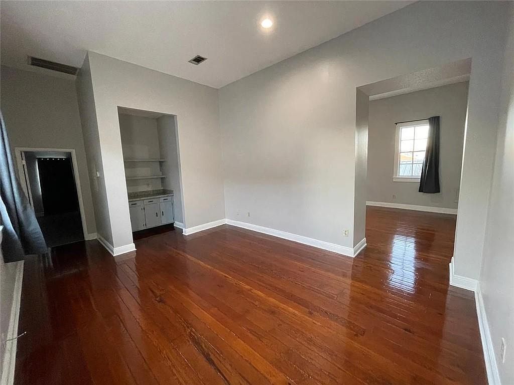 A spacious living area featuring polished, reddish-brown hardwood floors that add warmth and shine to the space. Walls are painted a soft, neutral gray, contrasting gently with crisp white baseboards and trim. The ceiling is high, enhancing the sense of openness, and features a recessed light. To the left, a small alcove with built-in shelves and cabinetry provides storage and display options. Two wide, open entryways connect the room to adjacent areas, one leading to a sunlit space with a large window and dark curtains, and another to a darker hallway, maintaining a fluid, open-concept layout with classic detailing.