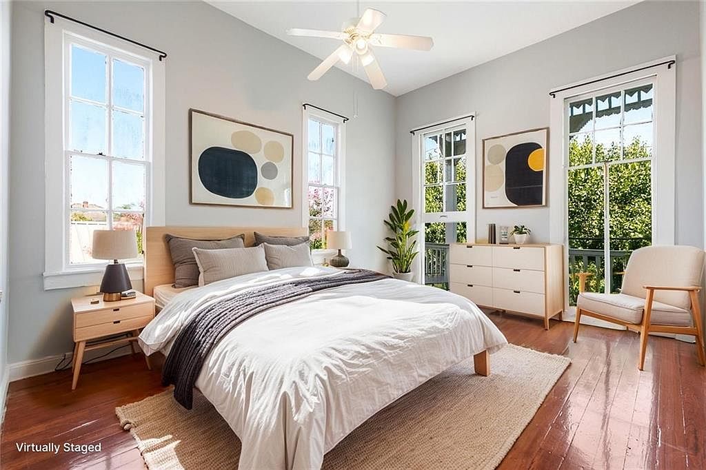 A bright, airy room featuring gleaming reddish-brown hardwood floors and tall ceilings. Three large windows line one wall, their white wood trim contrasting with soft, light-gray walls. Two of the windows are paired with a glass-paned door in the same style, leading outside and bringing in ample natural light. The simple ceiling fan adds functionality without detracting from the understated elegance. Minimalist black rod curtain hardware tops each window, and leafy greenery is visible through the glass, lending a peaceful, fresh atmosphere. The overall look feels clean, historic, and timeless, balancing simplicity with classic architectural charm.
