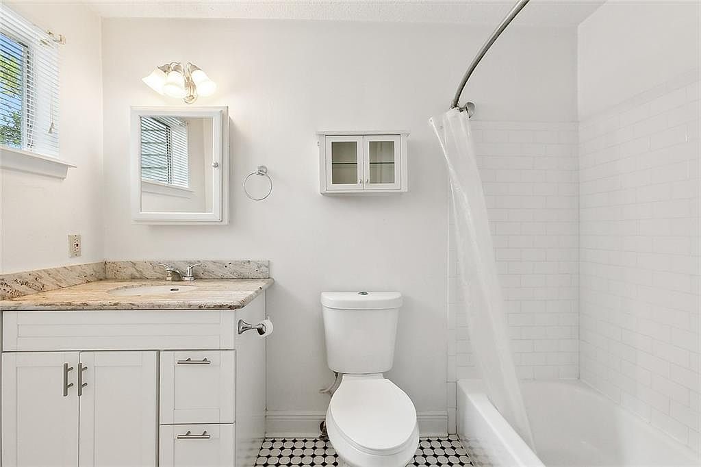 This bathroom features a clean, bright aesthetic with white walls and cabinetry. To the left, a vanity with a marble countertop and stainless steel faucet anchors the space below a mirrored medicine cabinet. Black and white hexagonal tile flooring adds a touch of vintage charm. The center holds a standard white toilet beneath a small, wall-mounted storage cabinet with glass doors. On the right, a white bathtub with a curved shower curtain rod and a transparent curtain sits against a wall of classic white subway tile. Two windows bring in natural light, enhancing the fresh, inviting atmosphere.