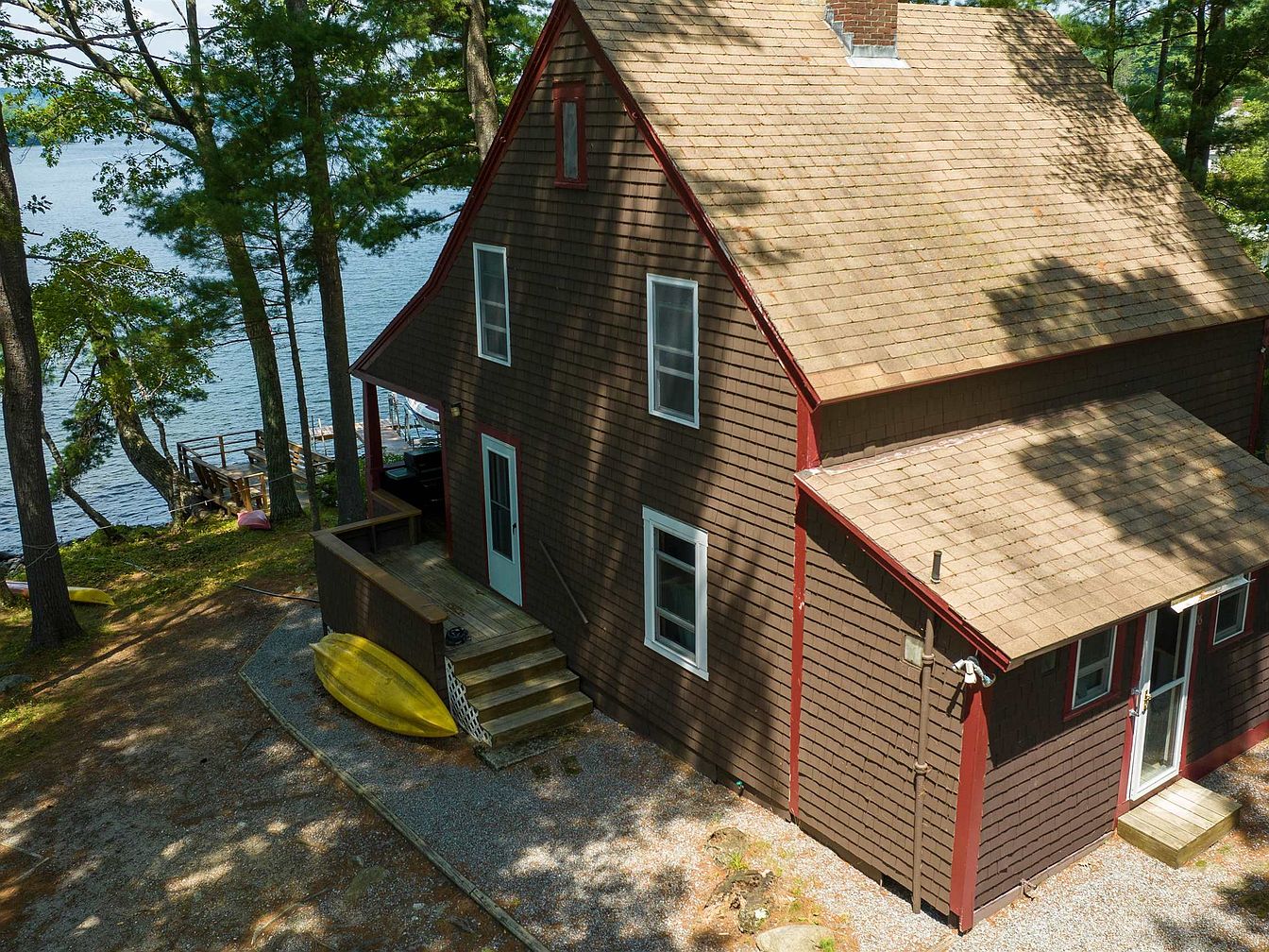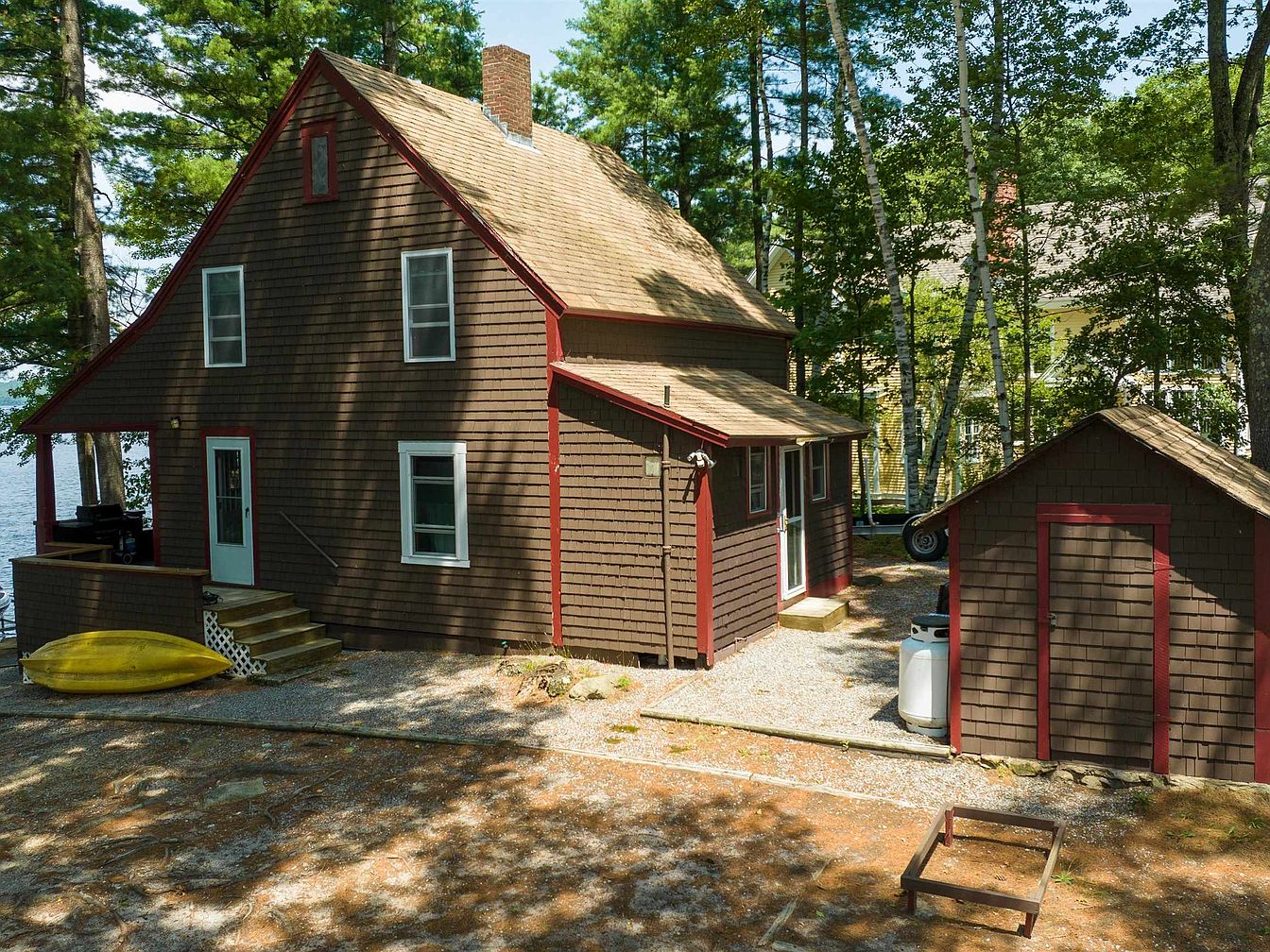 A brown shingle-sided house with red trim stands among tall trees, its sloped roof and brick chimney hinting at a classic, rustic style. Several white-framed windows punctuate the facade, and a small covered porch sits to the left, overlooking a nearby body of water. Steps lead up to the main entrance, adjacent to a canoe or kayak resting on the gravel. Next to the house, a detached shed with matching brown siding and red trim blends harmoniously with its natural surroundings. The property is shaded, with pine needles and dappled sunlight creating a peaceful woodland feel.