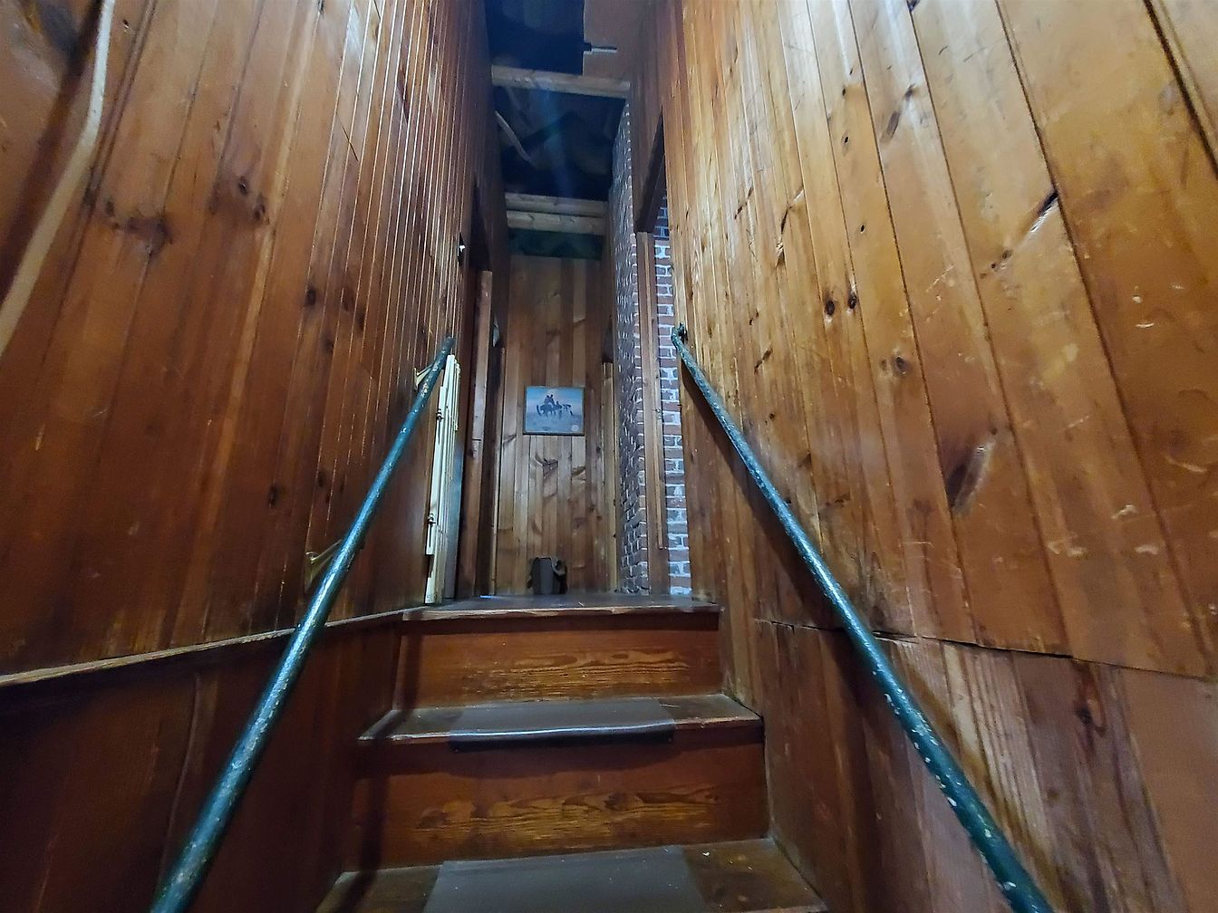 Narrow wooden stairs ascend between walls clad in vertical natural wood paneling, creating a cozy and rustic ambiance reminiscent of a cabin. The wood displays visible knots and grain patterns, contributing to the historic charm. Each step is bordered by simple metal railings painted dark green and affixed to the walls. At the top of the stairs, the hallway opens up to additional wooden paneling and a partial view of exposed brickwork. A framed piece of art featuring a figure on horseback is mounted on the far wall, adding a touch of character and nostalgia to the warm, intimate space.
