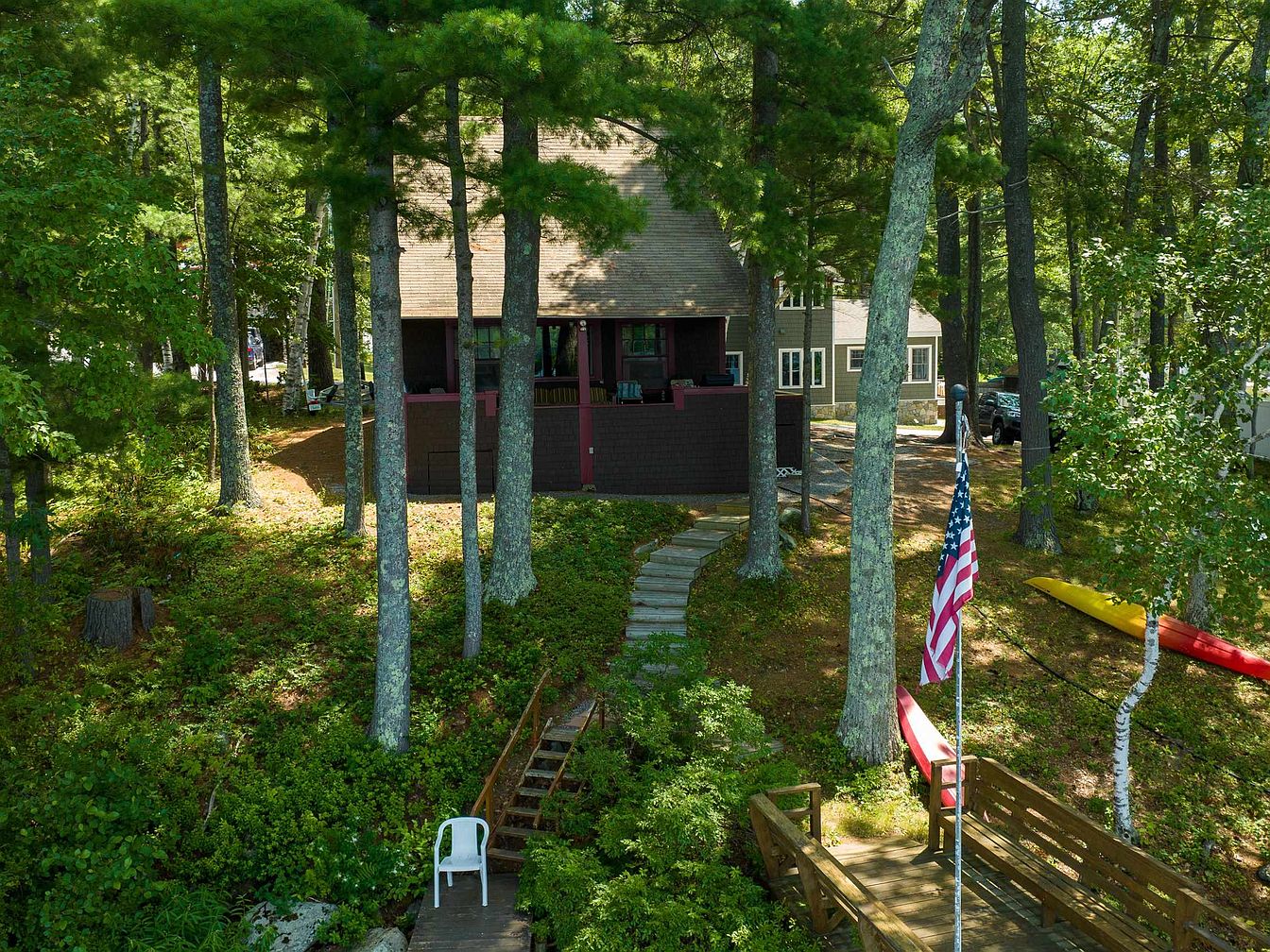 A wooden porch with a small staircase serves as the rear entry to a brown-shingled house accented by red trim. A bright yellow kayak is propped neatly against the porch, emphasizing recreational possibilities. Beyond the house, a grassy, gently sloped yard with mature trees leads to the water’s edge, where a private dock extends into the lake. White plastic chairs gather around a firepit, creating a relaxed natural seating area under the dappled shade. The tranquil water, dotted with distant boats, and the mixture of natural wood and earthy browns blend the home seamlessly into its serene lakeside setting.