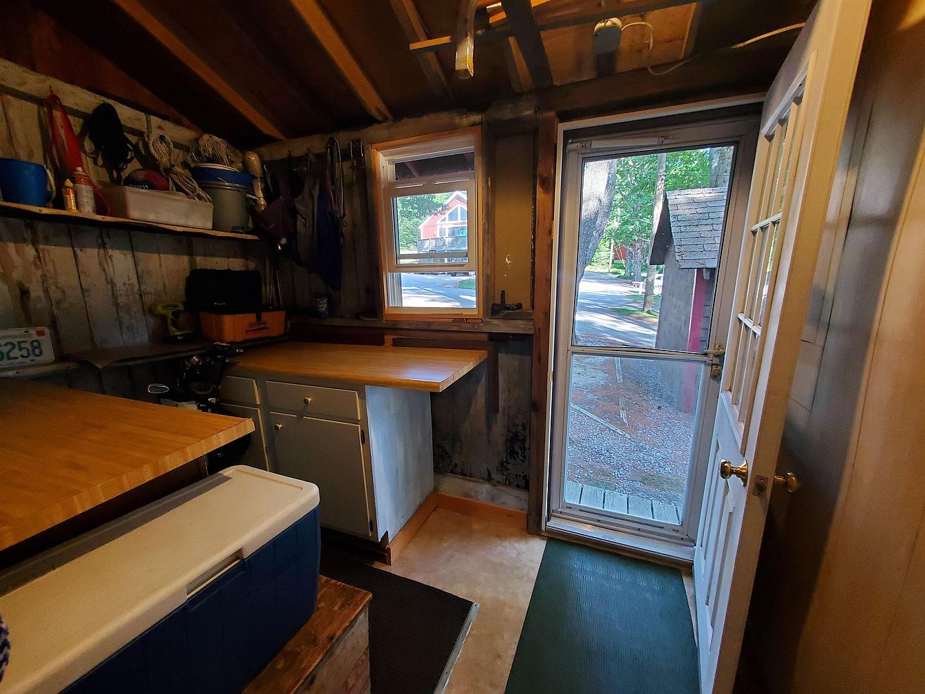 Compact mudroom area featuring rustic, weathered wood paneling on the walls and ceiling, highlighting exposed beams for a farmhouse feel. There are wooden countertops providing workspace, and a mix of open shelves and cabinetry for storage, holding bins, containers, and hanging bags. The space is utilitarian and practical, with a sturdy cooler on a wood bench and hooks holding various items, suggesting versatile use. Natural light pours in from a wide window and partially open door, creating a warm, inviting atmosphere while connecting the indoors to the outdoor surroundings. The overall style is functional with vintage charm.