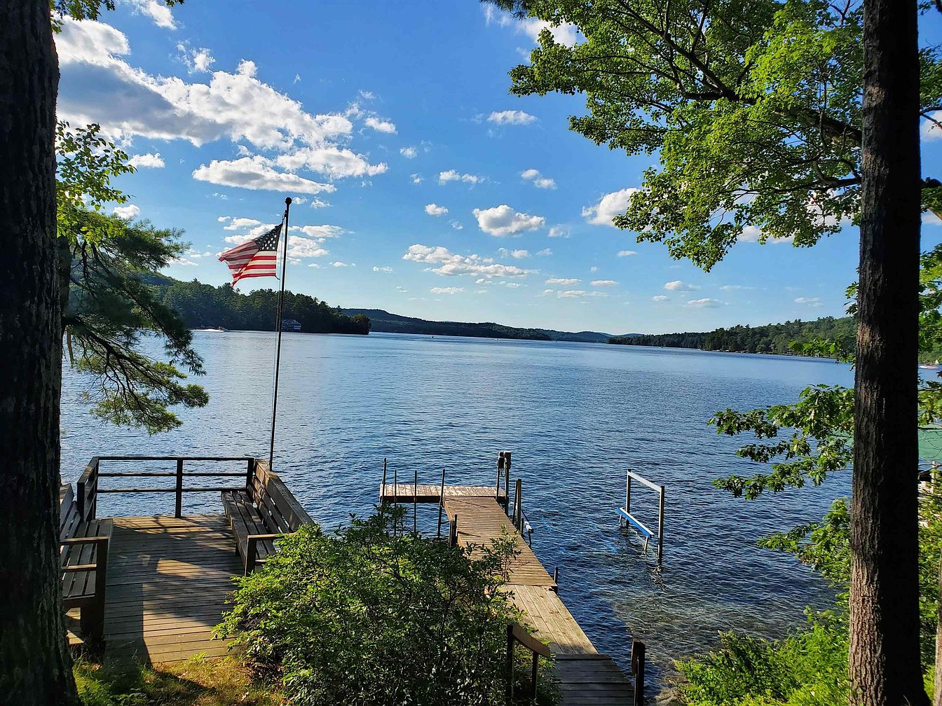 A wooden dock stretches over calm, clear lake waters, surrounded by tall trees and lush greenery. The dock features a cozy seating area with built-in benches, perfect for relaxing and enjoying the view. An American flag flutters at the edge of the dock, adding a patriotic touch to the serene setting. Across the water, distant hills and dense forests frame the horizon under a bright blue sky dotted with fluffy white clouds. Sunlight filters through the branches, casting gentle shadows and creating a peaceful, inviting outdoor retreat ideal for waterfront enjoyment.