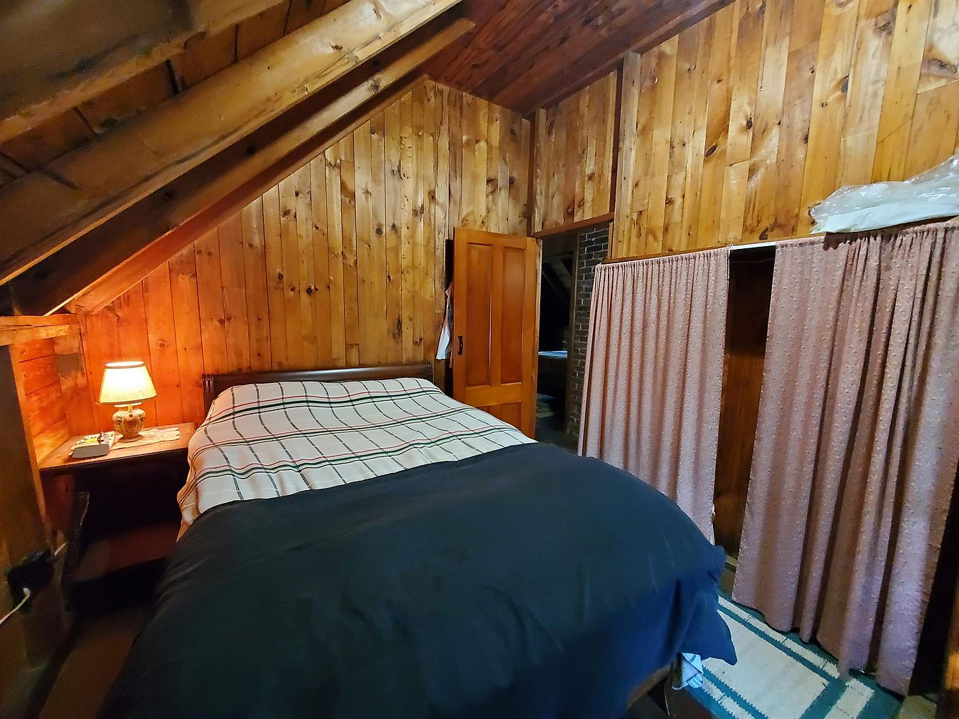 A cozy bedroom set in an attic-like space with angled, pine-paneled ceilings and walls, giving it a warm, rustic cabin ambiance. The bed, positioned against the slanted wall, is dressed in a checked cream and black comforter topped by a darker blanket. Beside the bed is a small wooden nightstand with a classic lamp casting a soft yellow glow, enhancing the intimate atmosphere. Opposite the bed, a simple closet area is concealed with gathered pink curtains. The floor displays a light-colored rug with blue and white stripes, adding a bit of softness to the otherwise wood-dominated space.