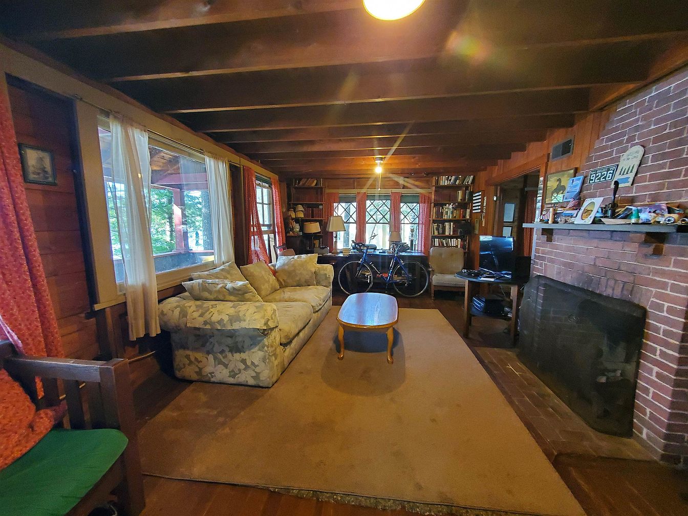 This cozy living room centers around a large brick fireplace flanked by natural wood paneling. The fireplace mantel holds a mix of small collectibles, framed art, and patriotic items, adding personality and warmth. Overhead, exposed ceiling beams contribute to the rustic aesthetic, while a wall-mounted clock and vintage decor reinforce the historic charm. The space features a cushioned wooden armchair and a small, dark wood TV stand with electronics. Visible bookshelves, an adjoining room with red curtains, and an inviting view into a vintage kitchen showcase a lived-in, welcoming atmosphere suited for relaxation and conversation.