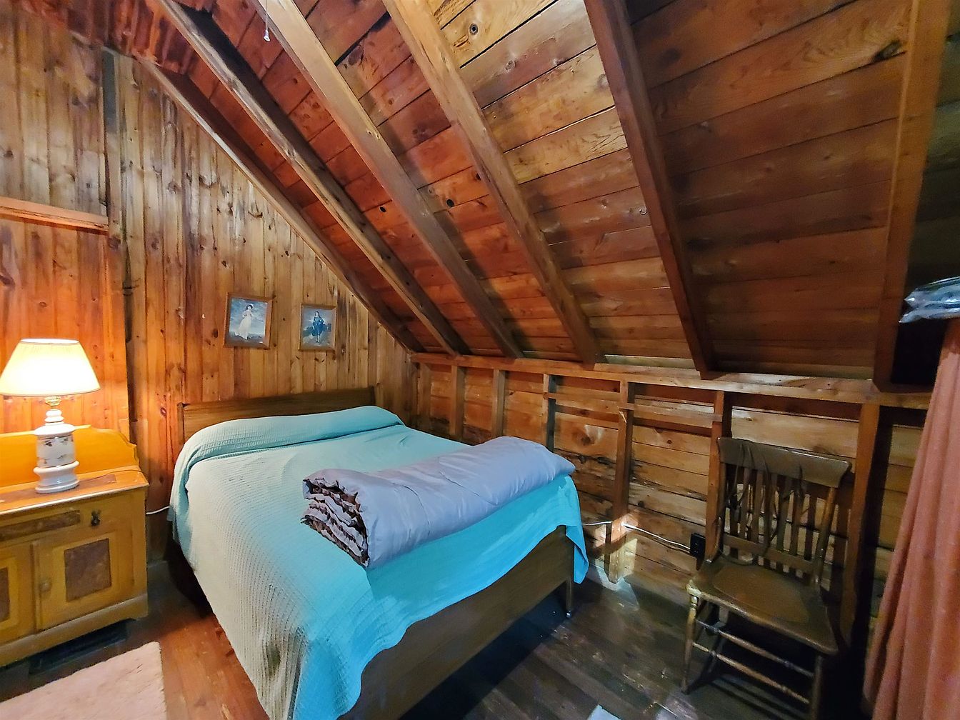 A cozy attic bedroom features warm, honey-toned wooden walls and exposed beams sloping overhead, creating an inviting, rustic ambiance. At the center, a wooden bed is dressed with a light aqua coverlet and a folded comforter at the foot. To the left, a vintage yellow nightstand with a ceramic lamp softly illuminates the room. Two small framed prints, featuring serene images, hang above the bed. A wooden rocking chair sits in the corner to the right. The room’s compact layout and use of natural wood give it a nostalgic cabin-like charm, evoking comfort and tranquility.