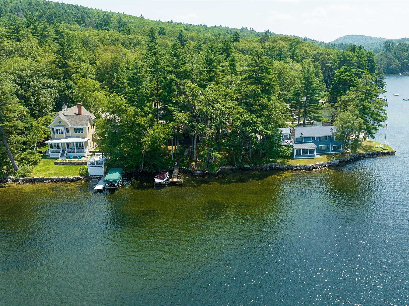 Aerial view of a lakeside estate featuring two historic American homes separated by a dense patch of trees. On the left, a classic yellow house with white trim sits atop a lush green lawn, its broad wraparound porch overlooking the water. A small dock with covered boat storage extends from the shoreline. To the right, a dark blue house with large lake-facing windows hugs the water’s edge, accented by a grassy yard and a small American flag. The homes are framed by tall pine trees and rolling hills in the background, highlighting a tranquil, secluded waterfront setting.