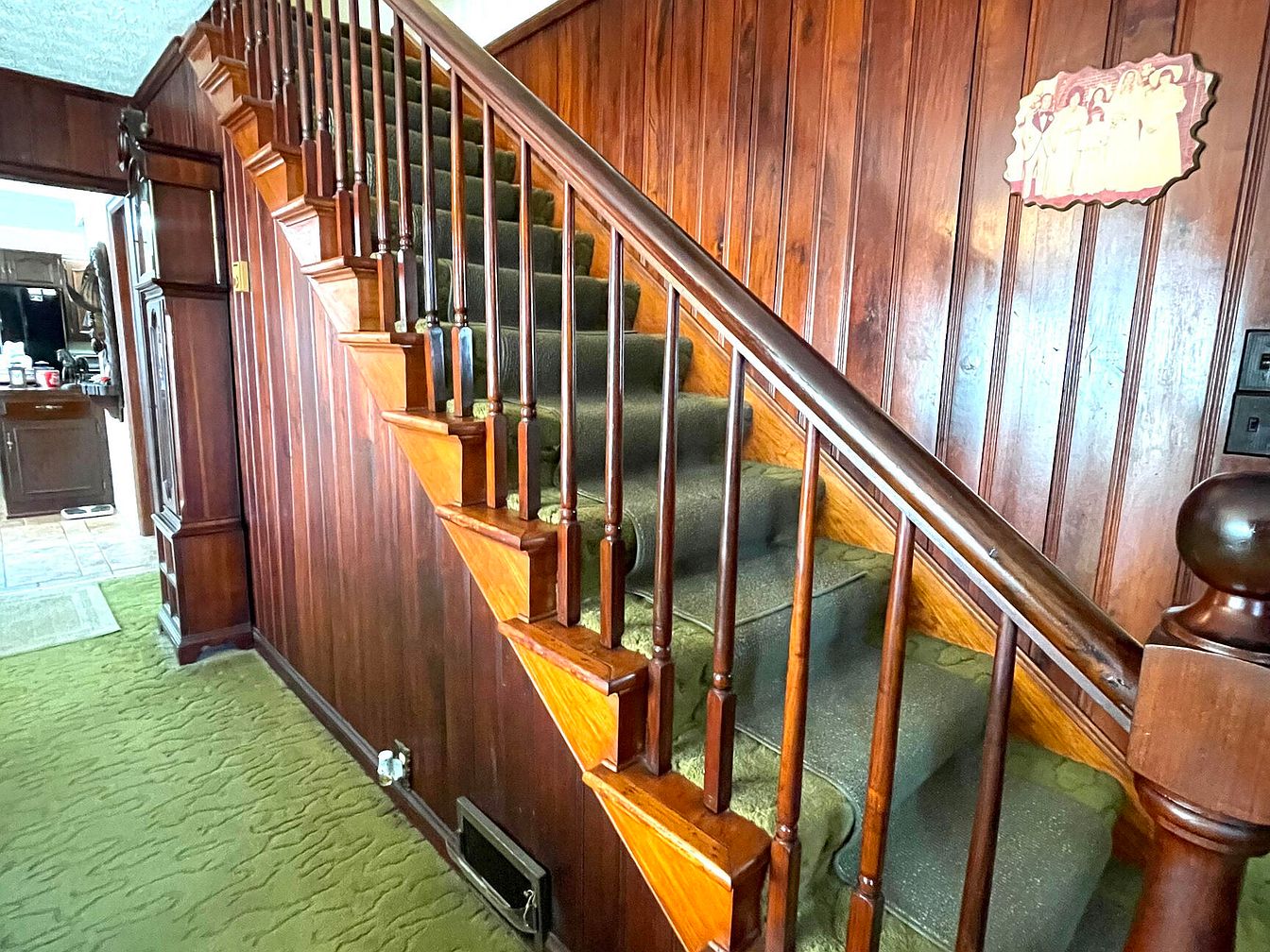 The staircase features rich, dark wood paneling that creates a warm, inviting atmosphere. Steps are upholstered in a deep green carpet, enhancing comfort while contrasting with the polished wooden handrail. The banister’s classic spindles add elegance and detail, leading upward into a softly lit space. A vintage artwork hangs on the wall, adding character and a personal touch. The textured wall creates visual interest, while the plush green carpet flows into the adjacent area, suggesting a coherent design style throughout the home. This space combines traditional craftsmanship with a cozy ambiance, reflecting the home’s historic charm.