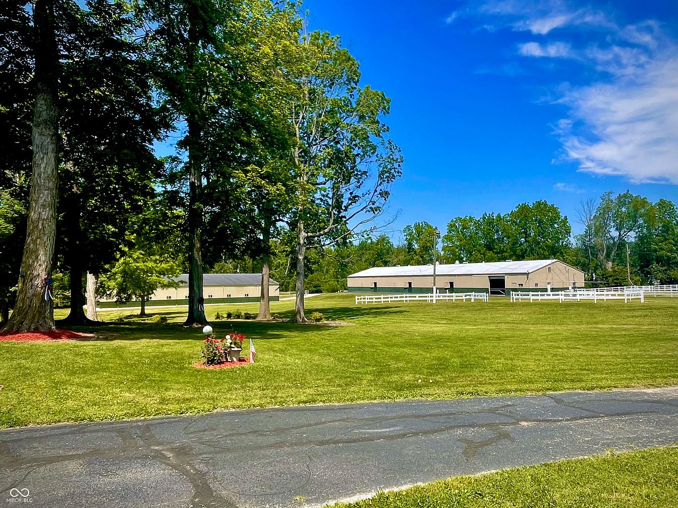 A sprawling outdoor area showcases lush green grass framed by tall, mature trees offering ample shade. In the background, a large equestrian barn features a simple, functional design with a light-colored exterior and a metal roof, complementing the vibrant landscape. A white fence gently outlines the property, enhancing its pastoral charm. In the foreground, a small flower arrangement adds a touch of color and personality, set against a backdrop of freshly mulched soil. The clear blue sky overhead imparts a serene atmosphere, perfectly blending nature and functionality in this tranquil setting.
