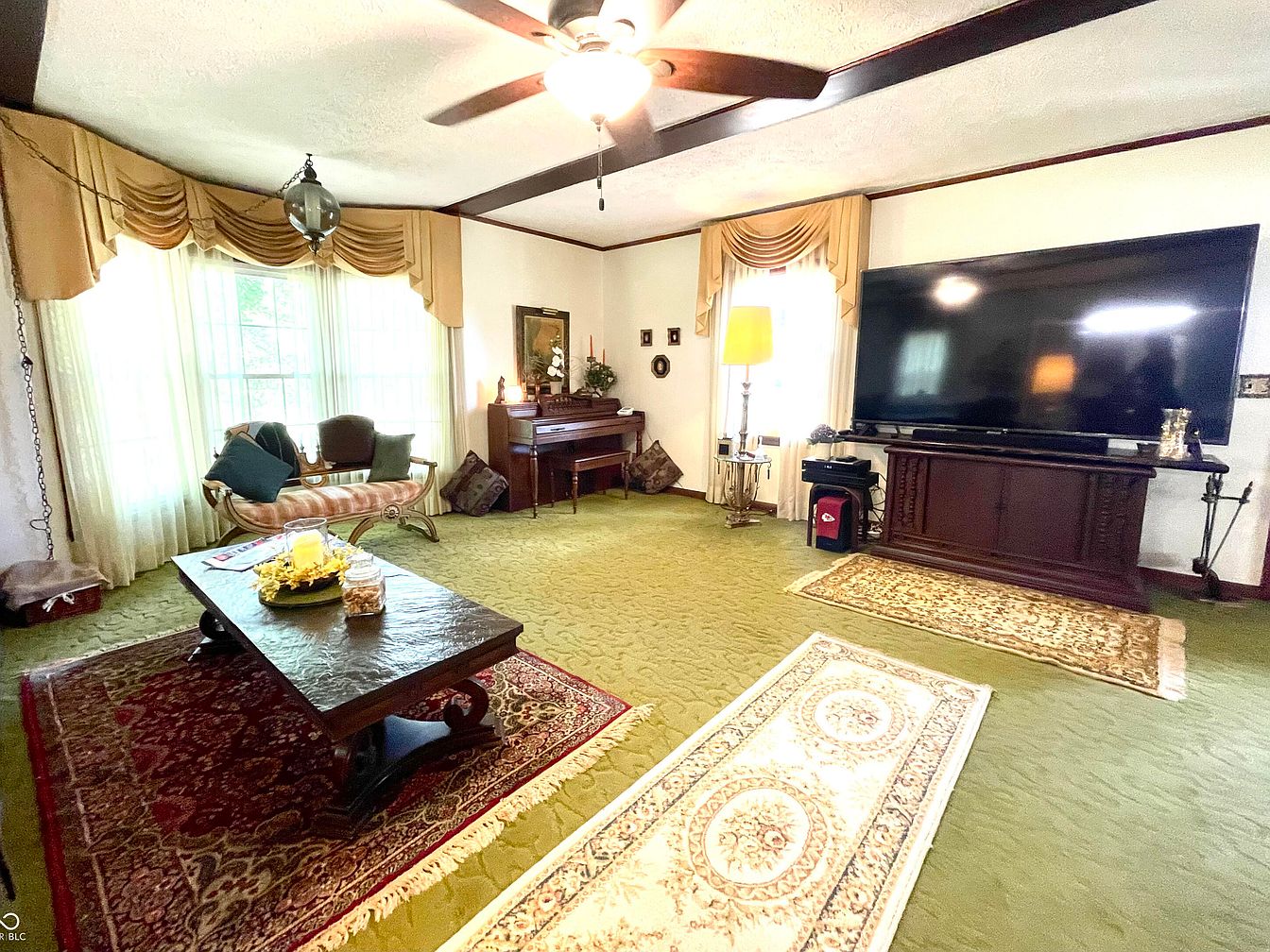 This living room features a cozy layout with a plush green carpet providing a warm ambiance. Generous natural light filters through large windows, framed by elegant, neutral-toned drapery. A vintage-style sofa with plush cushions sits beside a decorative side table, while an ornate coffee table dominates the center, adorned with a vibrant floral arrangement and decorative items. A grand television is set against a dark wood media console, blending traditional and modern elements. Two area rugs with intricate patterns enhance the space’s classic aesthetic. The ceiling showcases dark wood beams, adding architectural interest and depth.