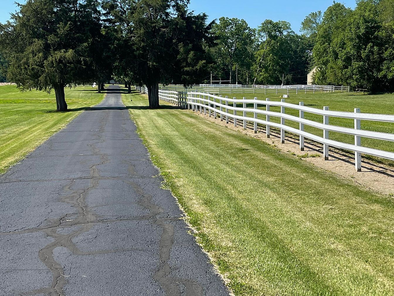 A long, paved driveway stretches ahead, flanked by tall, lush trees providing a natural arch overhead. The asphalt surface, slightly cracked in places, leads toward an open area visible in the distance. On the right, a neat white picket fence curves gracefully along the edge of well-maintained green grass, enhancing the property’s charm. The vibrant greenery contrasts beautifully with the crisp blue sky above, creating a welcoming and serene atmosphere. Sunlight filters through the trees, casting gentle shadows and highlighting the manicured lawn on either side, illustrating the timeless allure of this historic estate.
