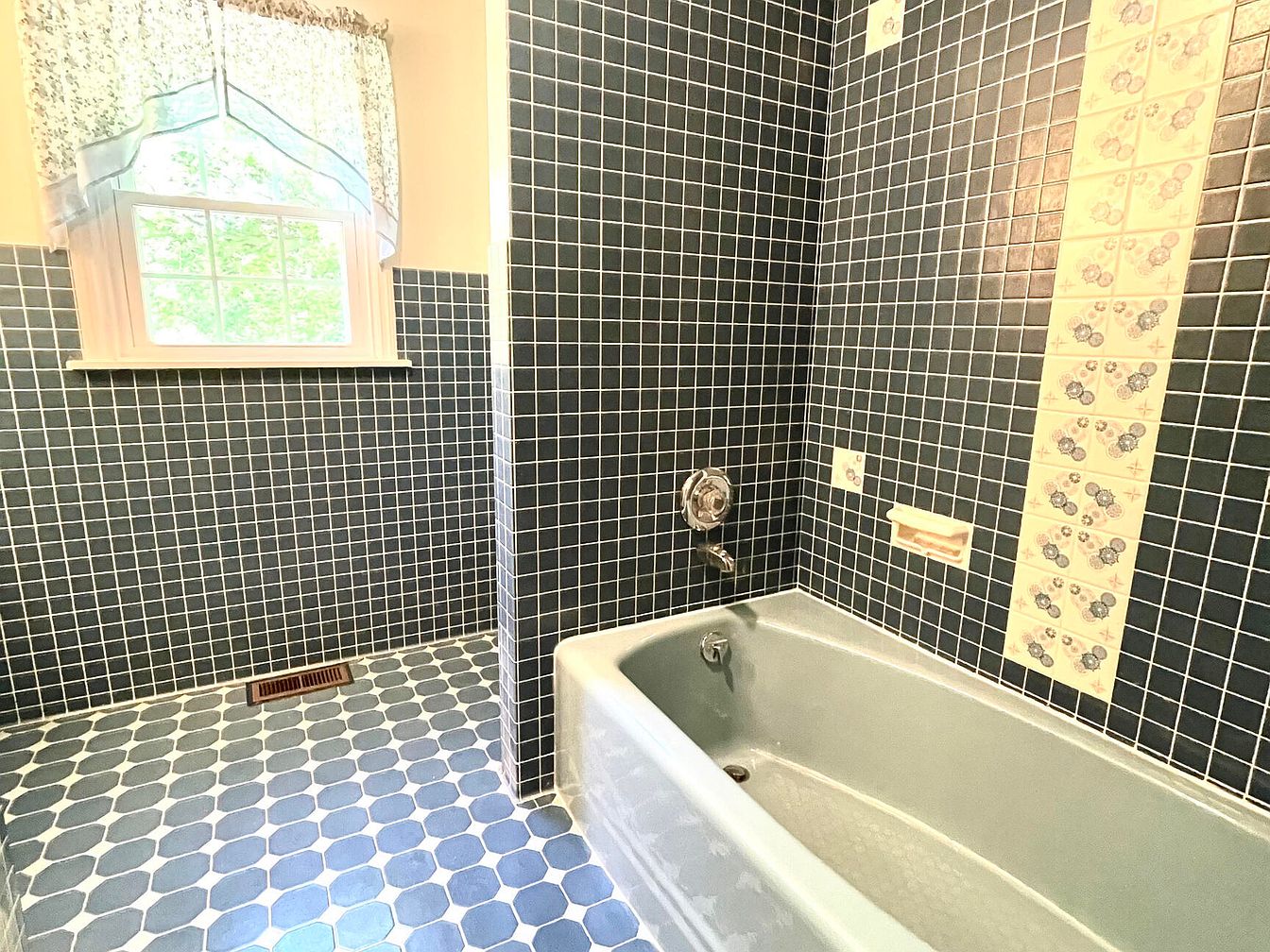 The bathroom features midnight blue tiles that cover the walls and floor, creating a cohesive aesthetic. A vintage-style tub, in a soft shade of blue, complements the tile work. The floor showcases hexagonal tiles, alternating darker and lighter blues, adding a dynamic texture. A large window draped with a delicate white curtain allows natural light to brighten the space. Decorative tiles featuring floral motifs are integrated into the walls, adding charm and warmth. The simple layout emphasizes functionality, while the color scheme evokes a retro but inviting atmosphere, perfect for relaxation.