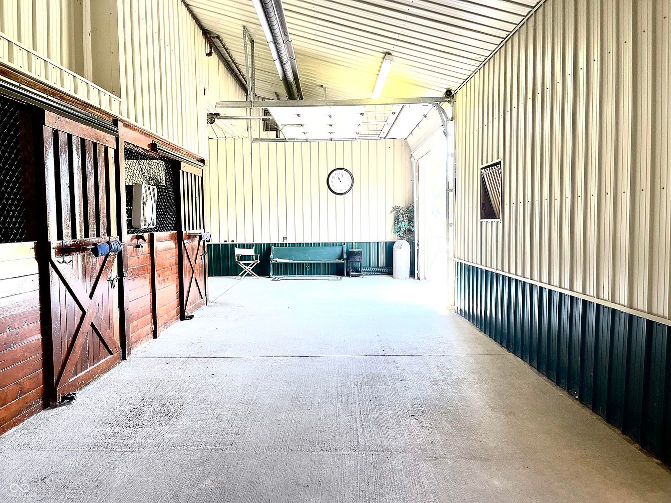 The stable features an expansive, open layout with high ceilings, accentuated by metal fluted walls and wooden stalls. Four wooden horse stalls with wire mesh fronts are visible on the left, showcasing a rustic charm through rich, dark wood. A clock is mounted centrally against the light-colored wall, enhancing functionality. The floor is a smooth, durable concrete, maintaining practicality. A pop of green is provided by a potted plant in the corner, contrasting the neutral tones. Folding chairs suggest a space for relaxation, while bright overhead lights illuminate the area, creating a clean and spacious environment.