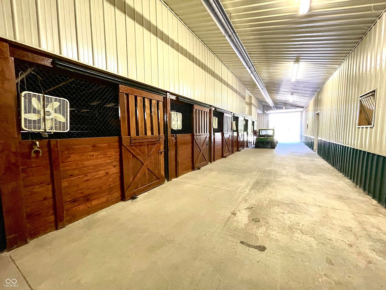 This is the interior of a stable, showcasing a long corridor lined with wooden horse stalls. The rich, warm wood tones of the stall doors contrast beautifully with the cool, metallic gray of the corrugated walls. Each stall features wire mesh windows for ventilation, complemented by ceiling fans for air circulation. The concrete floor is functional, leading to a wide exit illuminated by natural light at the far end. Above, the ceiling is high with bright fluorescent lights, creating an open atmosphere. A utility vehicle parked at the end suggests this space is well-utilized for both storage and horse care.