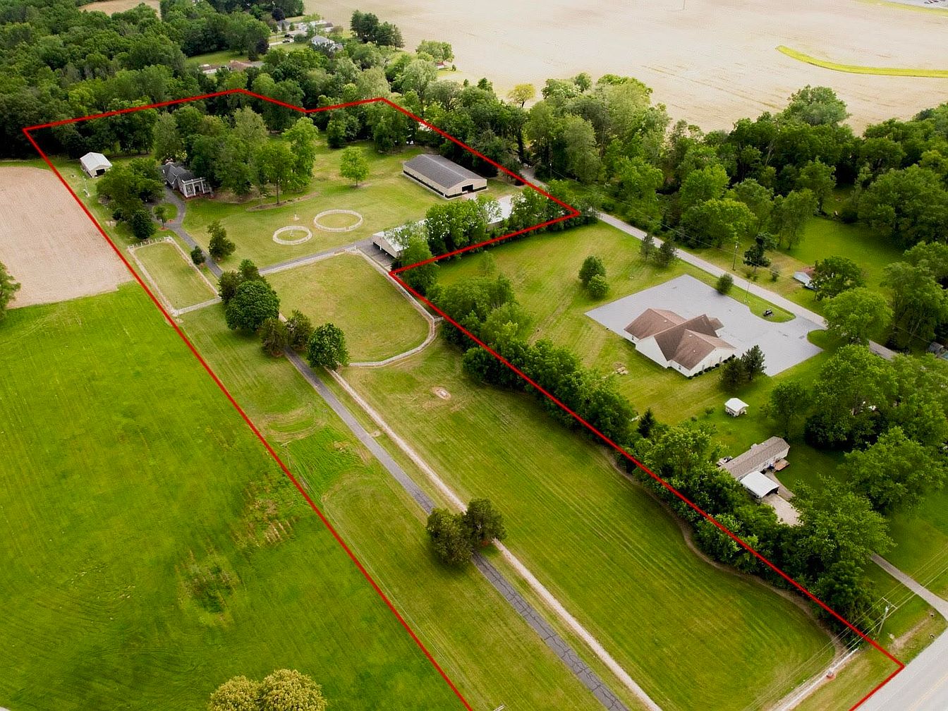 This remarkable 10-acre horse farm in Kokomo, IN, beautifully combines historical significance with modern amenities. Built in an elegant architectural style, the 5-bedroom home boasts over 5,000 sq ft of living space, featuring a kitchen, dining room, and an expansive family room. Key updates include a spiral staircase and a full apartment above a 3.5-car garage. The estate features three barns, including a heated indoor riding arena and 22 spacious horse stalls, making it ideal for equestrian enthusiasts. Listed at $1,250,000, this sanctuary offers tranquility and functionality while catering to a refined equestrian lifestyle, enhanced by lush grounds and 4.5 acres of grazing pasture.