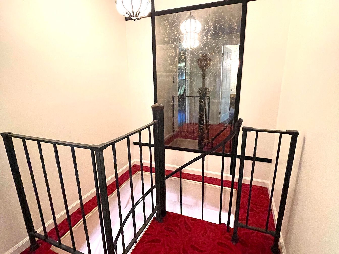This staircase landing features a rich, deep red carpet with an intricate pattern, creating an inviting atmosphere. A striking black wrought iron railing provides safety and contrast against the white walls, highlighting a blend of elegance and functionality. A decorative hanging light fixture casts a warm glow, enhancing the space’s charm. Opposite the staircase, a large mirrored wall reflects light and visually expands the area, adding depth. The simple yet sophisticated architecture emphasizes clean lines, while the combination of colors and materials creates a harmonious balance, making this landing a welcoming transition between levels.