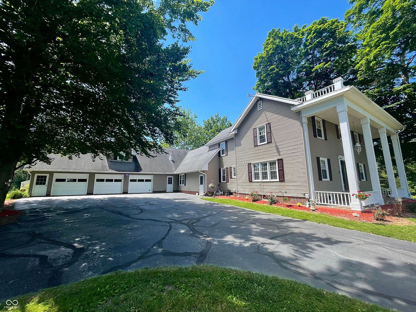 This charming historic home features a welcoming facade with a symmetrical design and an inviting front porch supported by white columns. The exterior showcases a light beige siding complemented by dark brown shutters framing the windows. A circular driveway gracefully leads to the attached garage, which has multiple doors. Lush green grass and manicured flower beds adorned with vibrant blooms add to the aesthetic appeal. The surrounding trees provide shade and depth, enhancing the tranquil atmosphere of the property. The clear blue sky beautifully contrasts with the house’s neutral tones, making it an inviting sight.