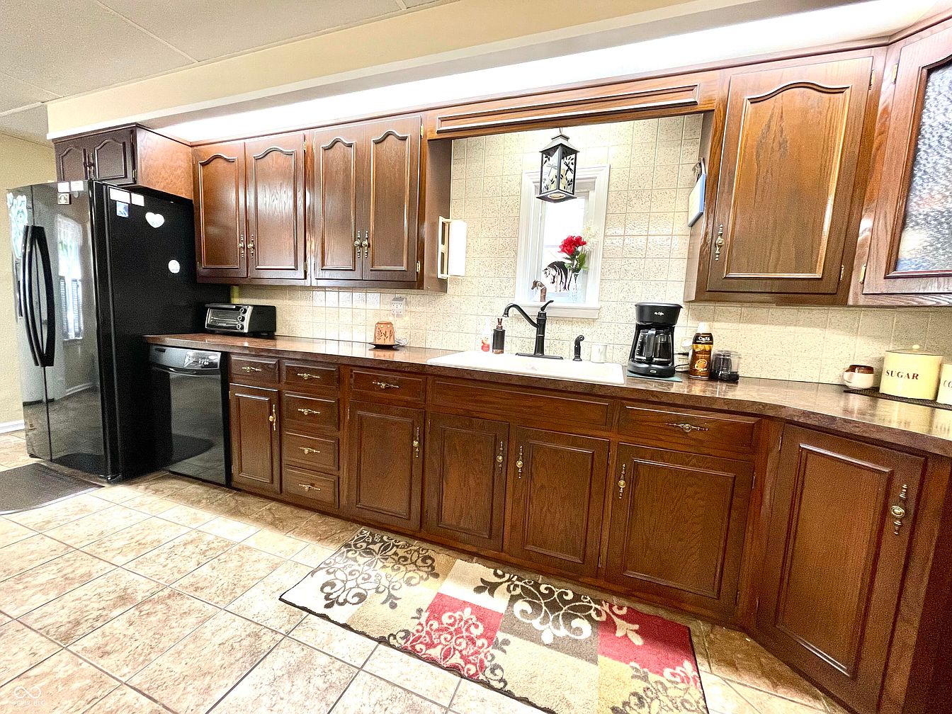 This kitchen features rich, dark wood cabinetry that contrasts with light wall tiles, creating a warm, inviting atmosphere. The countertop extends in a U-shape, providing ample workspace and housing a white sink with a stylish black faucet. A black refrigerator and an appliance station are seamlessly integrated into the cabinetry design. Decorative elements include a floral arrangement in a wall mirror, alongside modern kitchen appliances like a coffee maker. The floor showcases a mix of tile and an ornate area rug, adding both color and texture, enhancing the cozy rustic aesthetics of the space.