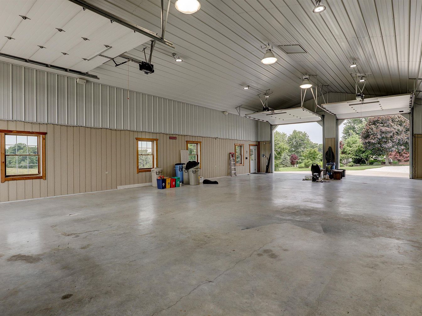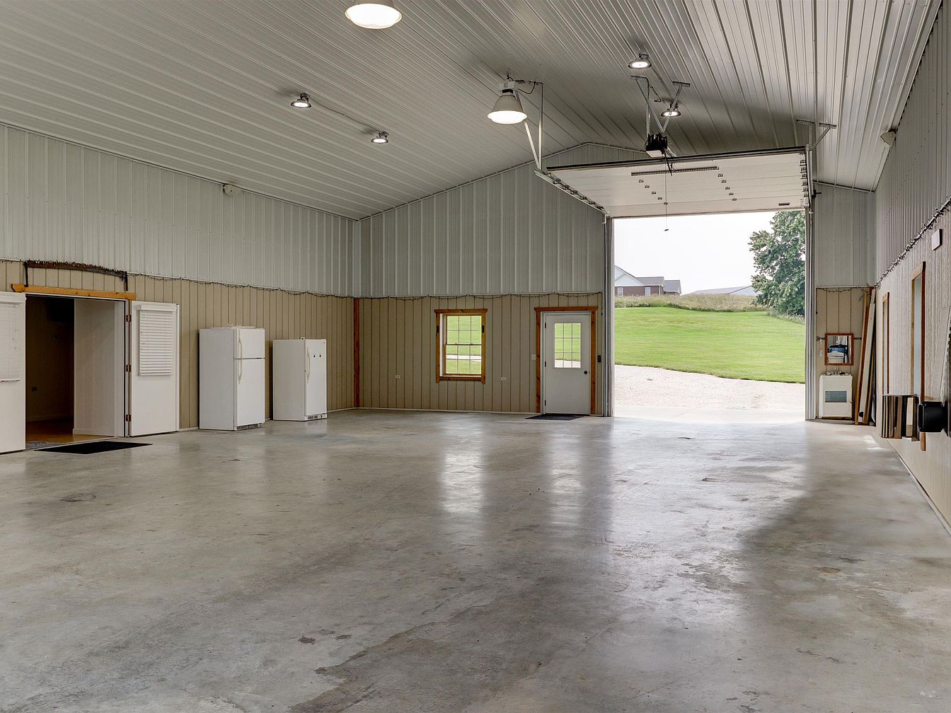 A spacious garage with a high, metallic ceiling features a polished concrete floor, enhancing the industrial feel. The walls are clad in light-colored metal siding, providing a clean, modern appearance. On one side, three white refrigerators are neatly arranged, offering utility for storage. The entrance includes a large overhead door, allowing natural light to flood in and offering a view of the expansive green landscape outside. A door leading to a smaller room adds functionality, while ample lighting fixtures brighten the entire area, making it suitable for various activities from vehicle storage to workshops.