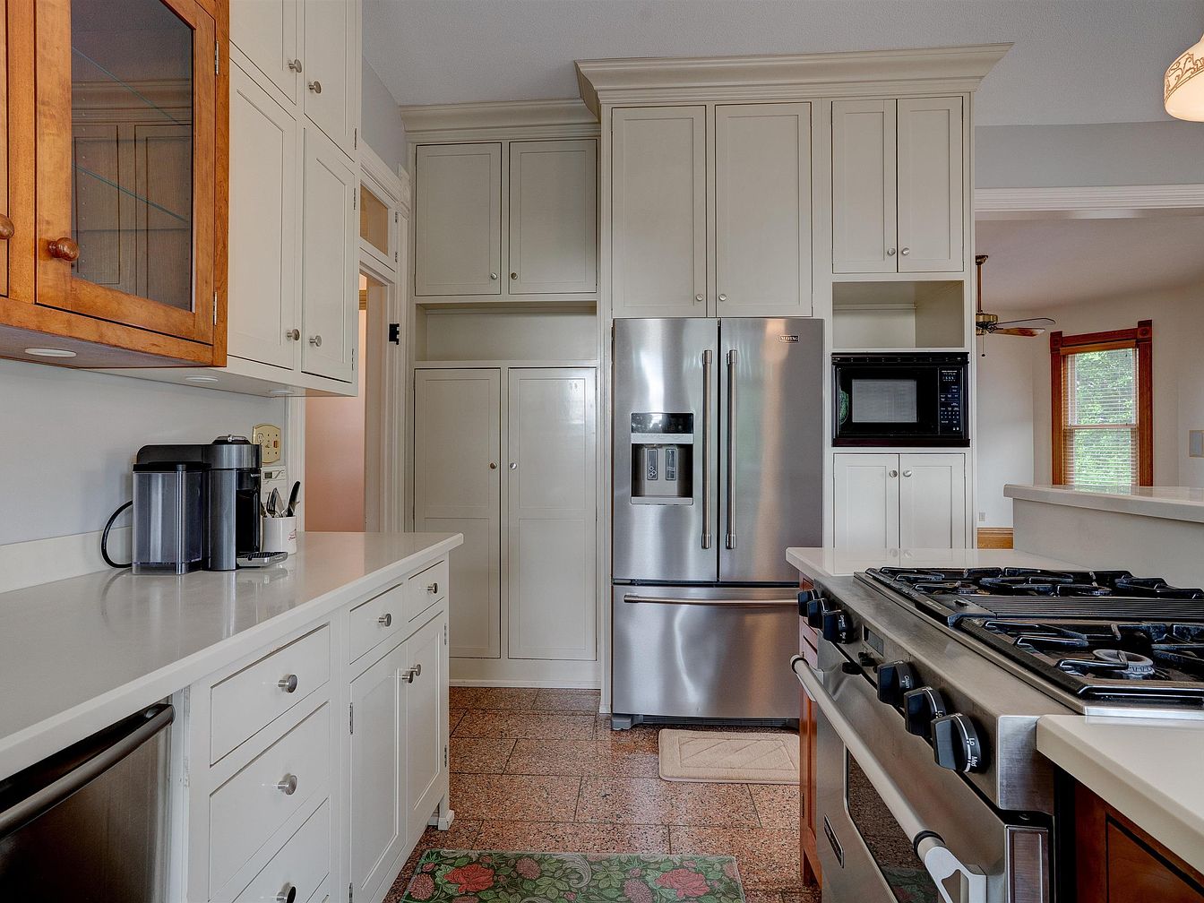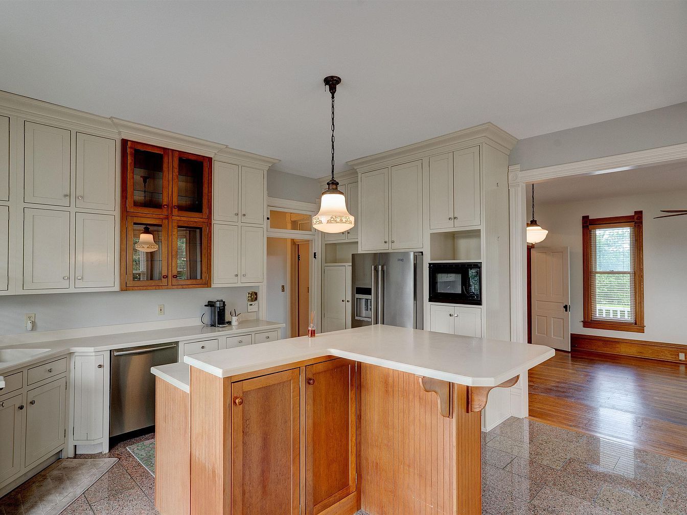 This kitchen features a blend of modern and classic elements, showcasing a spacious layout. Light-colored cabinets with a smooth finish complement the white countertops, while a wooden island adds warmth and character. The cabinetry includes glass-front sections, allowing for display storage. Pendant lamps hang above the island, providing soft lighting. Stainless steel appliances, including a refrigerator and microwave, integrate seamlessly. The flooring combines tile and wood, extending toward a doorway leading to another room bathed in natural light from multi-paned windows. Rich wood trim and window frames enhance the historic aesthetic, creating an inviting atmosphere.