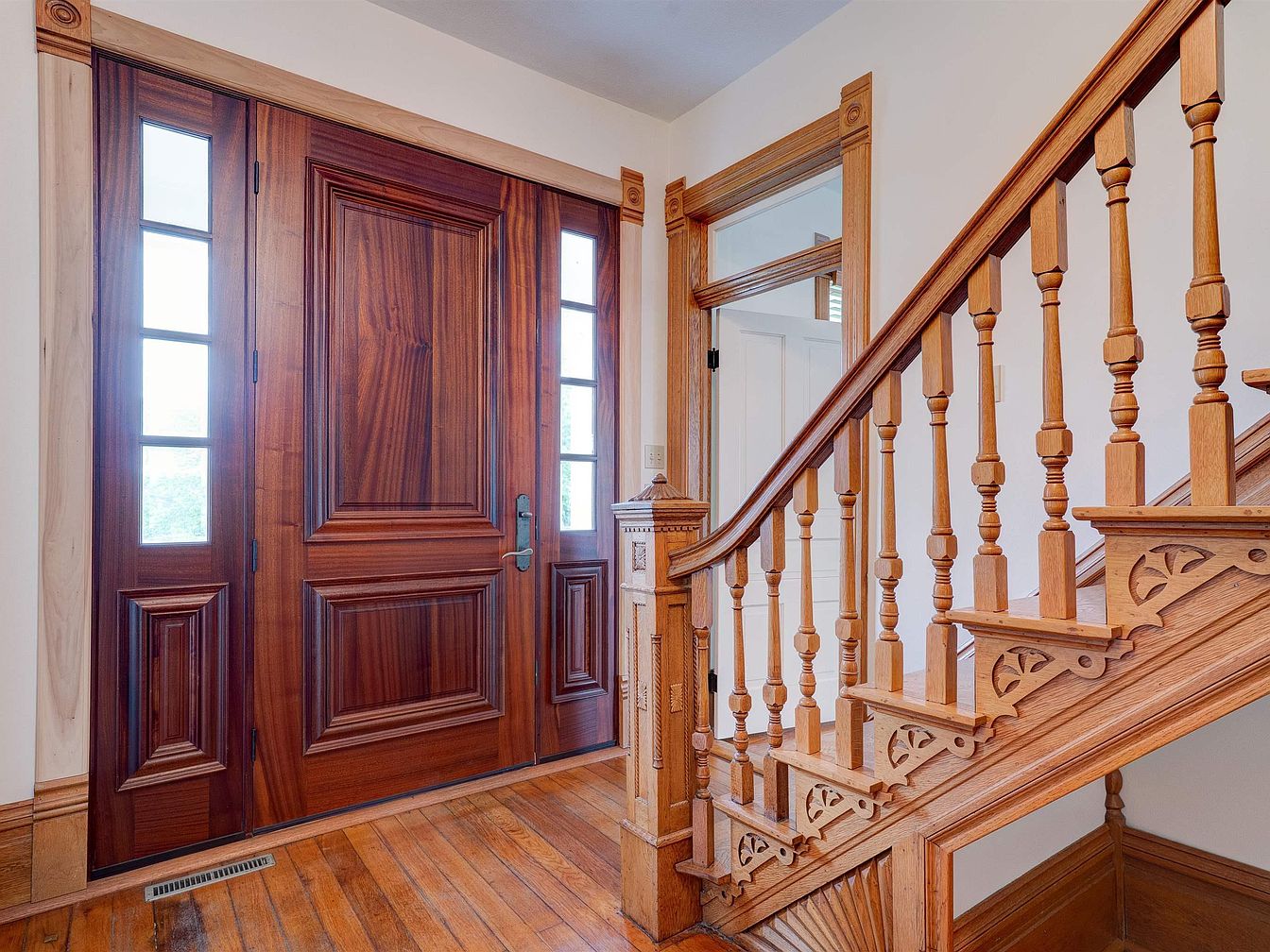 This entryway showcases an impressive wooden door with intricate panels and elegant sidelights that allow natural light to filter in. The rich, polished mahogany of the door contrasts beautifully with the lighter wooden trim that frames it. To the right, a grand staircase features ornate balusters and carefully carved details, adding charm and sophistication. The warm wooden floor enhances the inviting atmosphere of the space. The walls are painted in a soft, neutral tone, allowing the architectural elements and wooden features to stand out, creating a harmonious blend of traditional elegance and modern comfort.