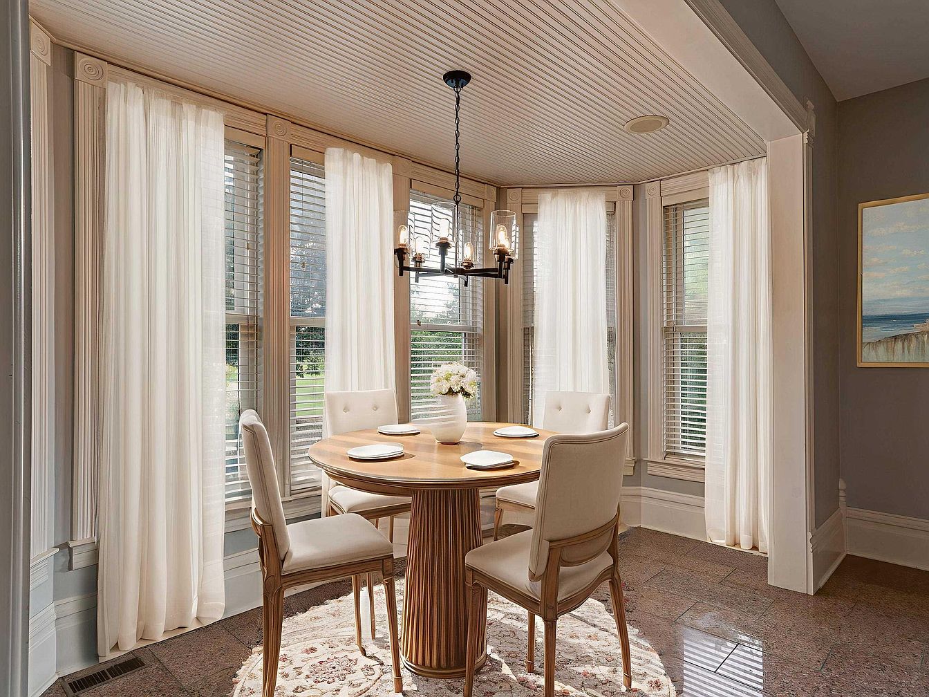 A cozy dining nook illuminated by a stylish chandelier, featuring a round wooden table surrounded by four elegant, cushioned chairs. The soft cream color of the chair upholstery complements the light beige wall, enhancing the airy feel of the space. Tall windows adorned with sheer white curtains allow abundant natural light to filter in, highlighting the intricate wood paneling of the ceiling. A patterned area rug adds a touch of warmth underfoot, while a simple vase of flowers serves as a centerpiece, bringing a natural element to this inviting, serene environment.