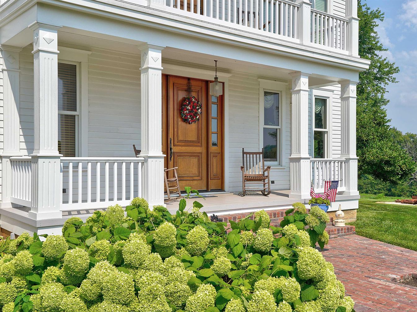 The front porch features classic design elements with tall, white columns adorned with decorative carvings. A warm wooden front door, embellished with a wreath, welcomes visitors. The floor is a combination of light-colored tiles and aged bricks, enhancing the rustic charm. Two rockers sit invitingly on either side, promoting relaxation. Lush, green hydrangeas with rounded blooms fill the base, providing a vibrant contrast against the neutral house siding. The surrounding greenery frames the entrance, while large windows allow natural light to illuminate the space, creating an inviting atmosphere. A patriotic décor element peeks from the side, adding character.