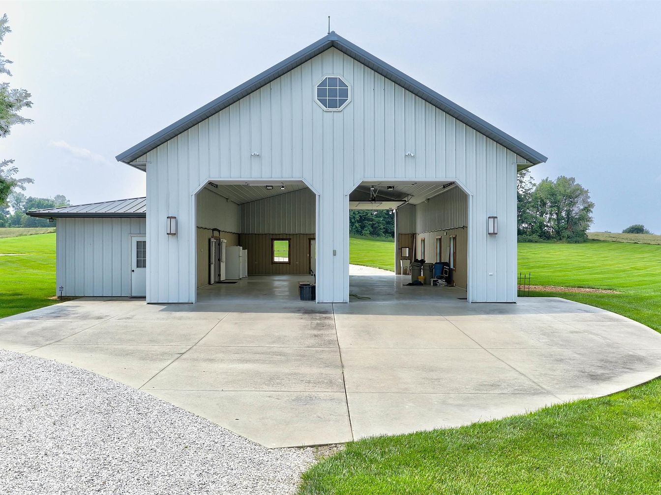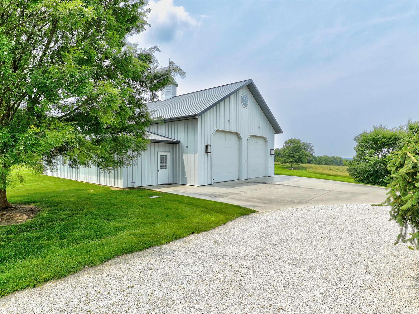 A well-maintained garage with a light, airy facade and a sloped, grey metal roof provides a functional yet aesthetically pleasing element to this rural property. The garage is flanked by lush green trees, enhancing the natural surroundings. The driveway is paved, leading smoothly to the double doors that allow for easy access. The surrounding yard is meticulously landscaped, featuring a variety of shrubs and small trees, with crisp, striped grass patterns creating a neat, manicured appearance. In the distance, additional structures can be seen, set against a backdrop of gentle hills and open fields.
