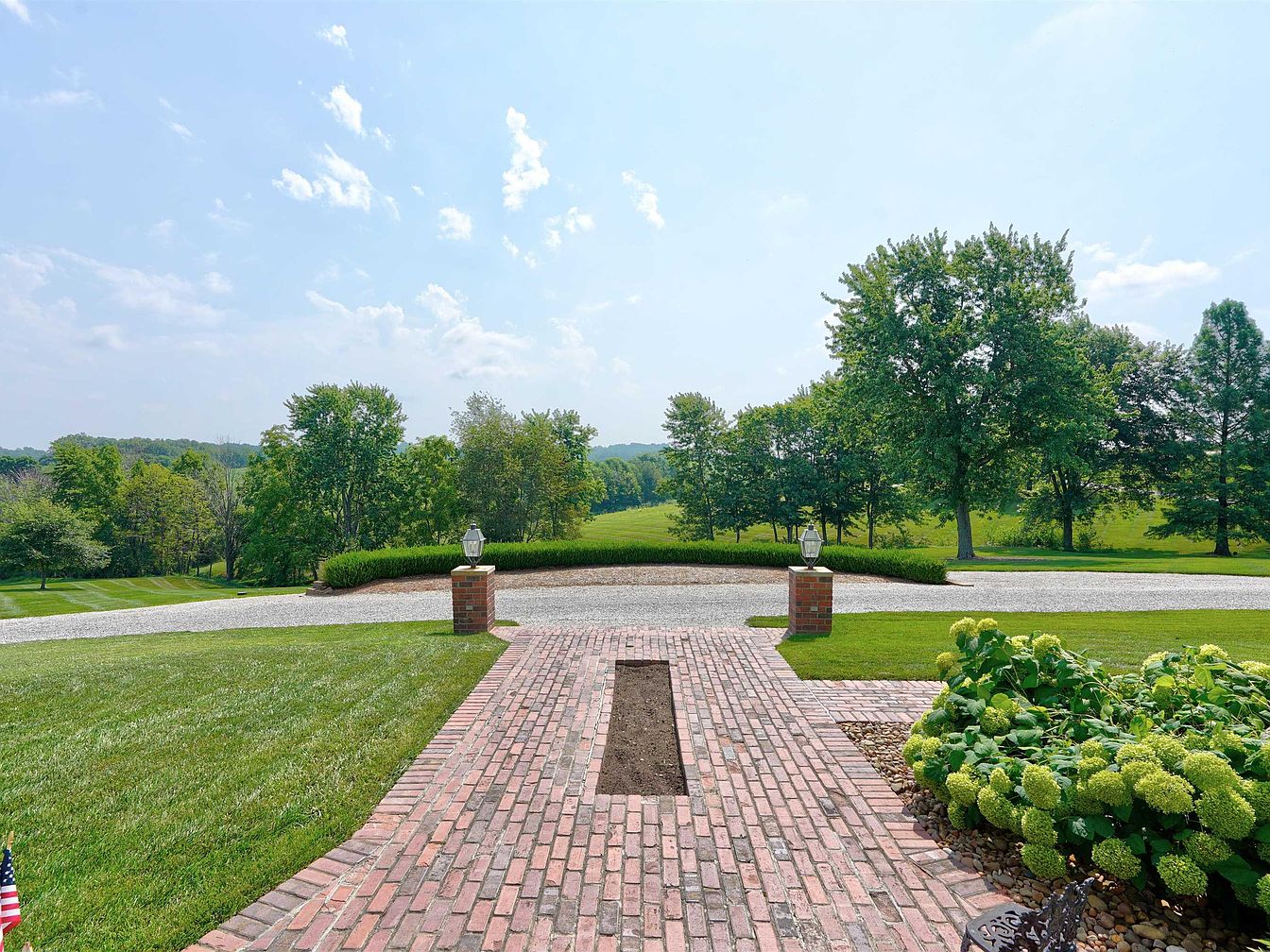 The front entrance features a charming brick walkway leading to a manicured lawn and expansive views of the surrounding landscape. Lush green grass frames the path, accented by clusters of hydrangeas bursting with soft green blooms. On either side of the walkway, sturdy brick pillars hold elegant lanterns, providing a warm welcome. The gravel driveway stretches out, inviting guests, while gentle slopes of greenery create depth in the view. The sky is bright with scattered clouds, enhancing the serenity of the setting, making it an inviting first impression of this historic home.