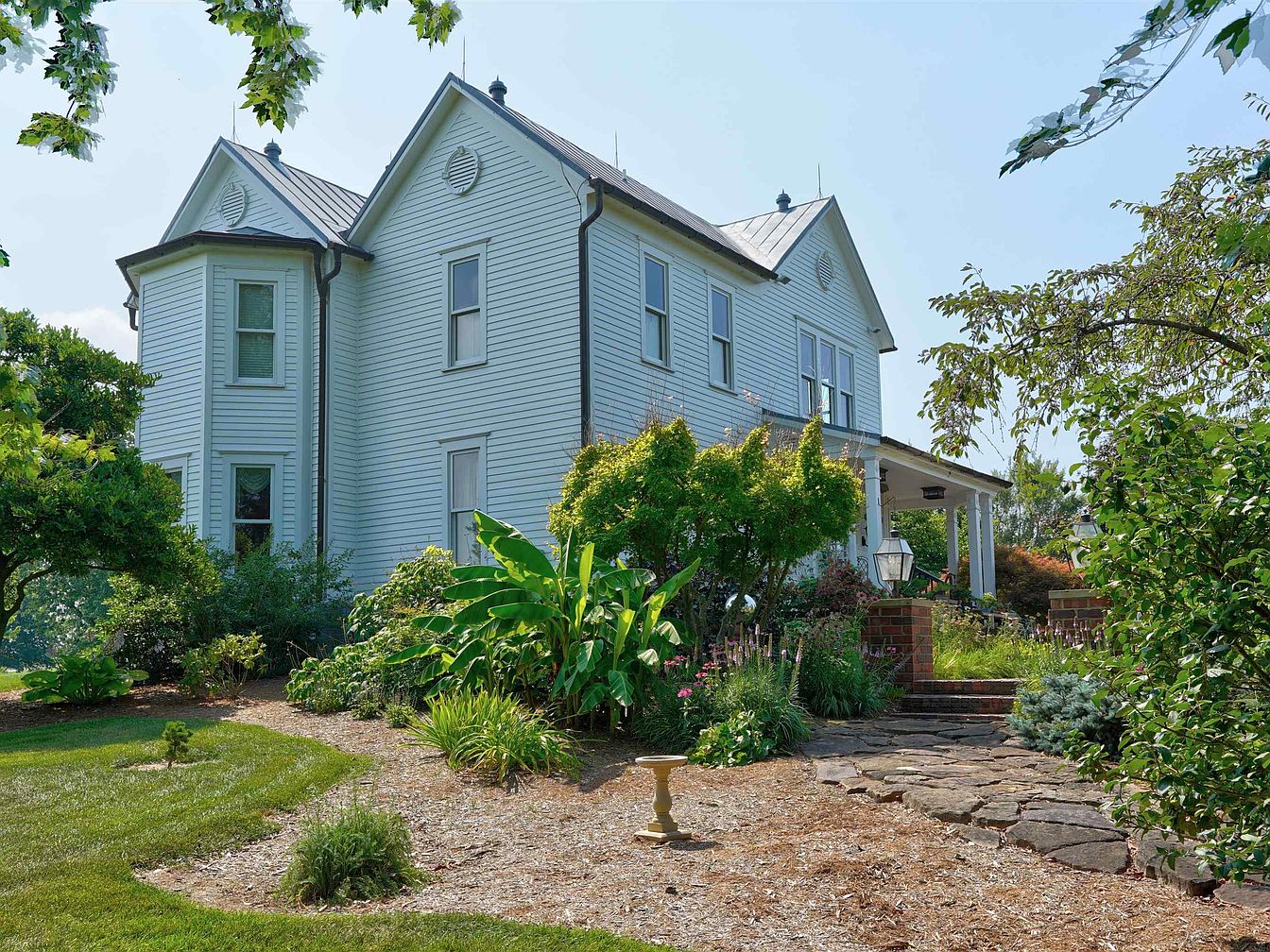 The image shows a charming historic American home, featuring a symmetrical facade with a gently sloped metal roof. The exterior is clad in white siding, accentuating its traditional aesthetic. A central door, framed by two elegant sidelights, serves as the focal point, highlighted by a decorative wreath. The spacious front porch, adorned with white railings, invites relaxation. Lush greenery surrounds the home, including well-maintained lawns and vibrant bushes, enhancing the serene atmosphere. The gravel driveway leads up to the residence, complementing the natural landscape and creating a welcoming entrance. This setting embodies classic Americana.