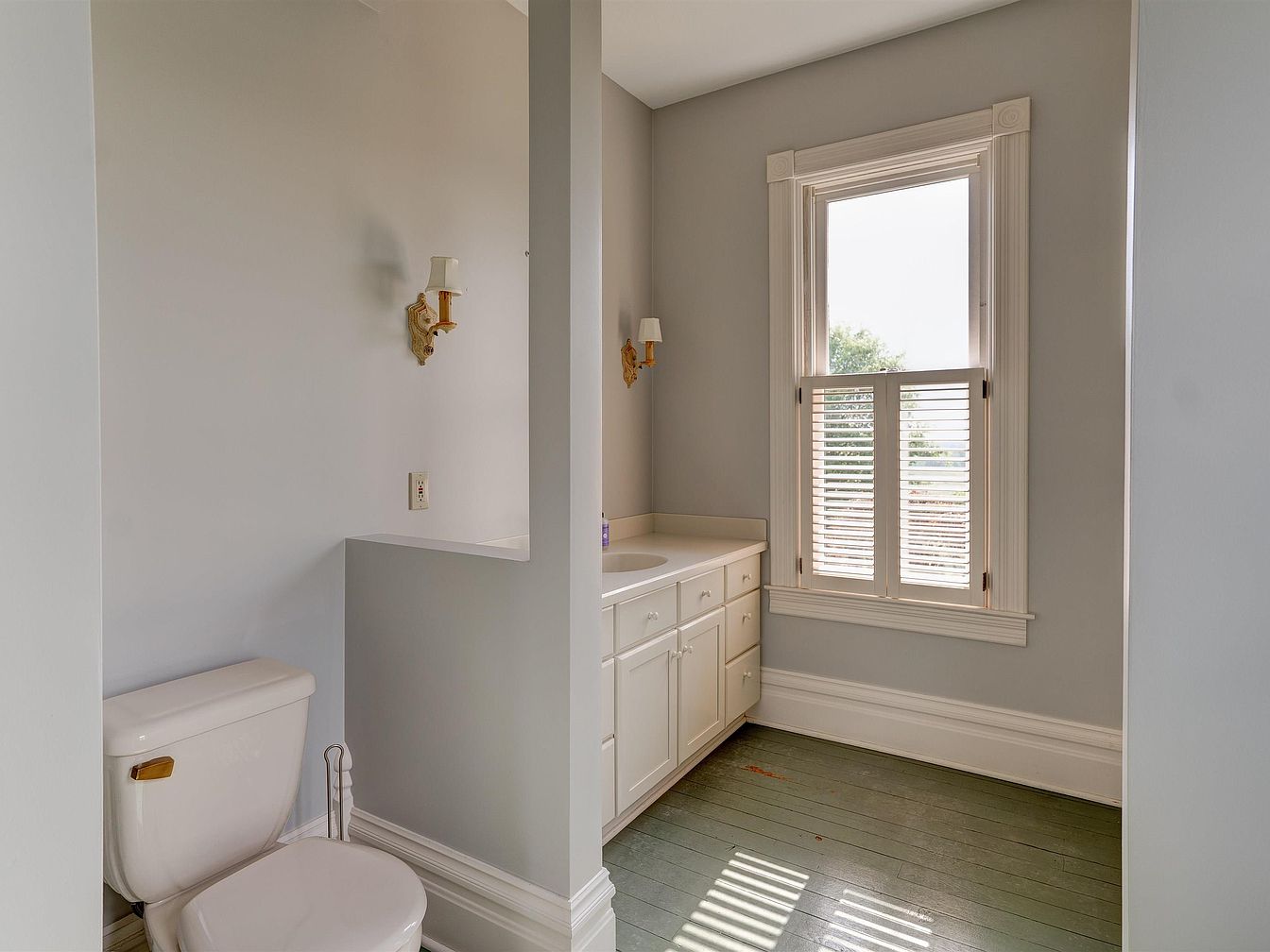 This bathroom features a subtle gray color scheme that enhances its spaciousness and tranquility. A classic white vanity with ample countertop space sits against the wall, complemented by white cabinetry. Natural light streams in through the double-hung window, framed by elegant white trim and adorned with wooden shutters, providing privacy while allowing for ventilation. Decorative wall sconces with vintage styling add warmth and ambiance. The flooring showcases a muted green that contrasts harmoniously with the walls, while a standalone toilet occupies a dedicated nook, ensuring a functional layout. Overall, the design balances historical charm with modern simplicity.